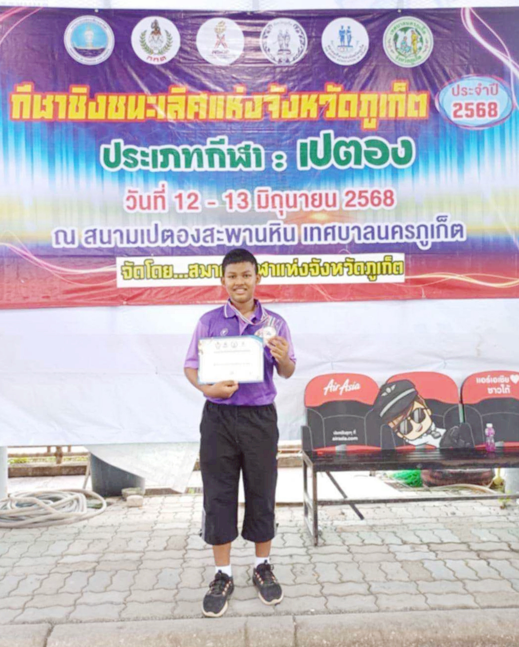 โรงเรียนภูเก็ตวิทยาลัยขอแสดงความชื่นชม ยินดี เด็กชายพงษ์ฉัตร ปจันทบุตร์ ม.1/8 รางวัลเหรียญเงิน รุ่นอายุไม่เกิน 16 ปีชาย ประเภททีม การแข่งขันเปตอง รายการกีฬาชิงชนะเลิศแห่งจังหวัดภูเก็ต ประจำปี 2568 ระหว่างวันที่ 12-13 มิถุนายน 2568 ณ สนามเปตองสะพานหิน เทศบาลนครภูเก็ต ผู้จัดการทีม ดร.วัชรศักดิ์ สงค์ปาน ครูผู้ฝึกสอน นางสาวอัมราภรณ์ ปจันทบุตร์