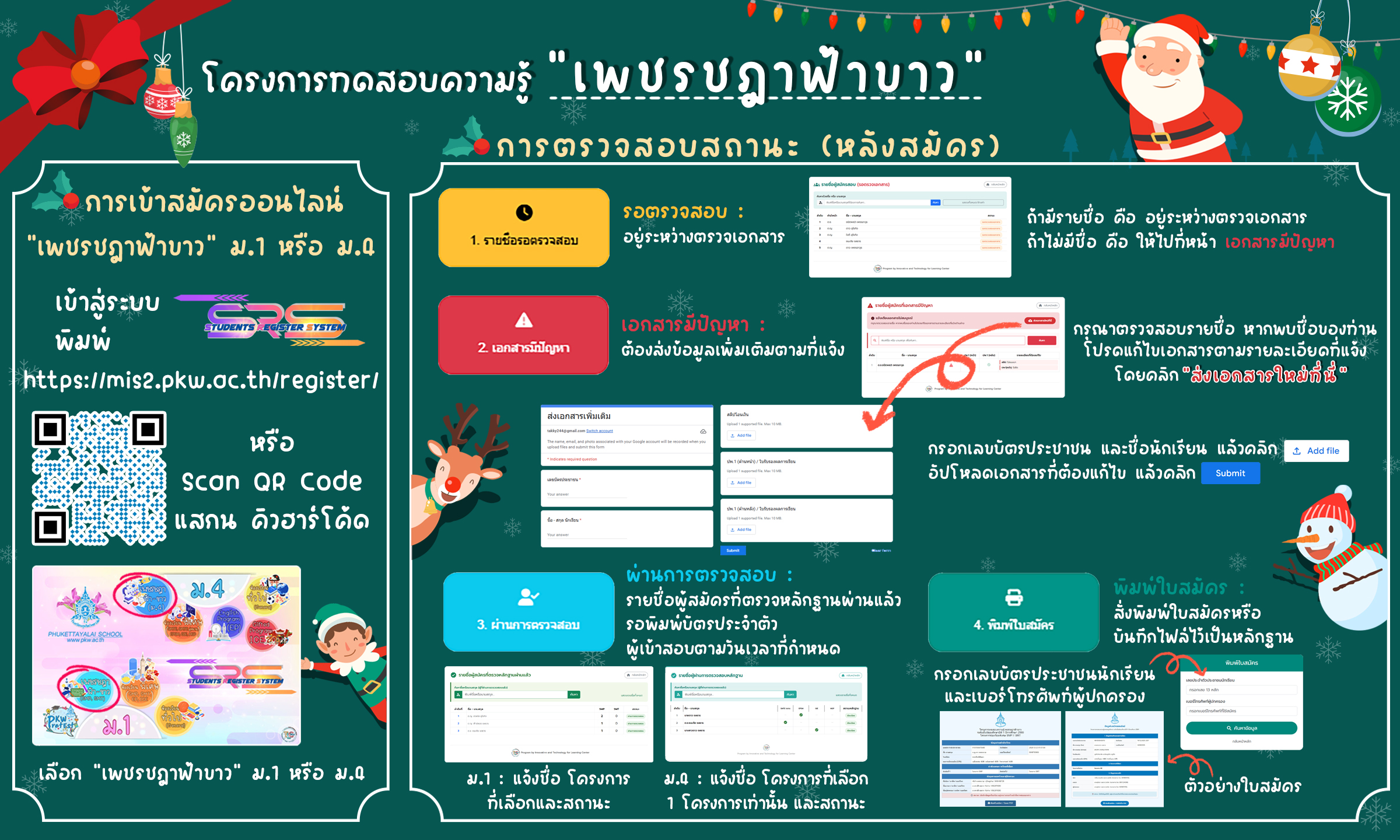ขั้นตอนการสมัครโครงการทดสอบความรู้ "เพชรชฎาฟ้าขาว" ชั้นมัธยมศึกษาปีที่ 1 และ 4 ปีการศึกษา 2569 ตัวอย่างสลิปโอนเงิน ตัวอย่าง ปพ.1 ด้านหน้า ตัวอย่าง ปพ.1 ด้านหลัง