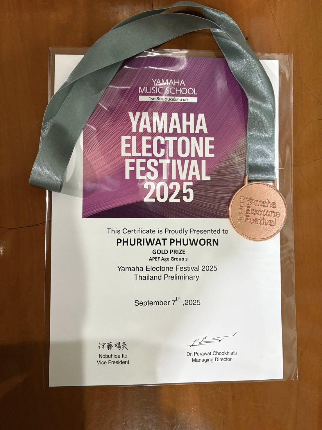 โรงเรียนภูเก็ตวิทยาลัยขอแสดงความชื่นชม ยินดี เด็กชายภูริวัฒน์ ภู่วรณ์ ม.1/2 รางวัล Gold Prize รุ่น APEF Age Group 3 (12 - 14 ปี) การแข่งขันในรายการ Yamaha Electone Festival 2025 (YEF2025) วันที่ 7 กันยายน 2568 ณ YDACC ชั้น M อาคารสยามปทุมวัน เฮ้าส์