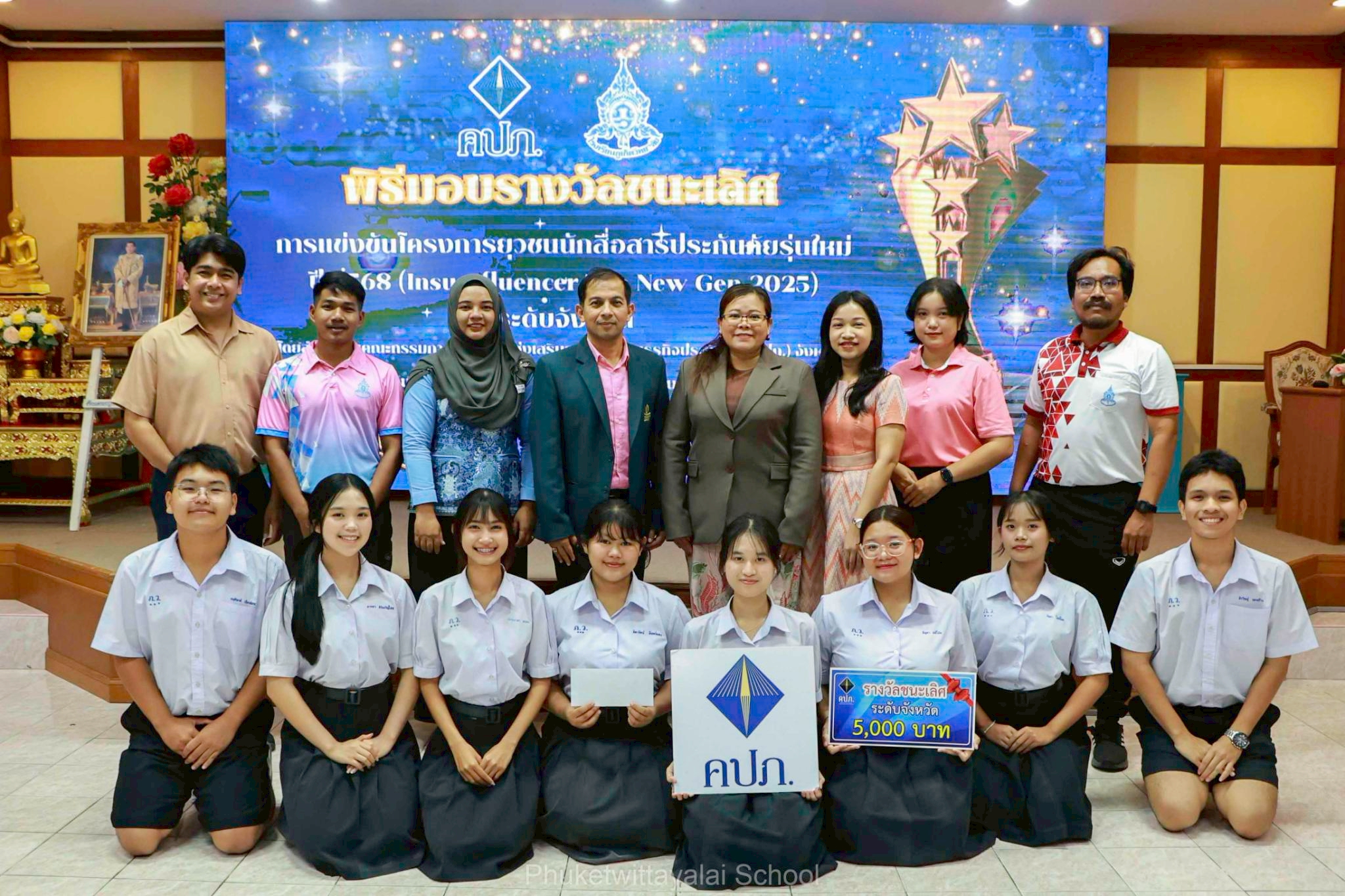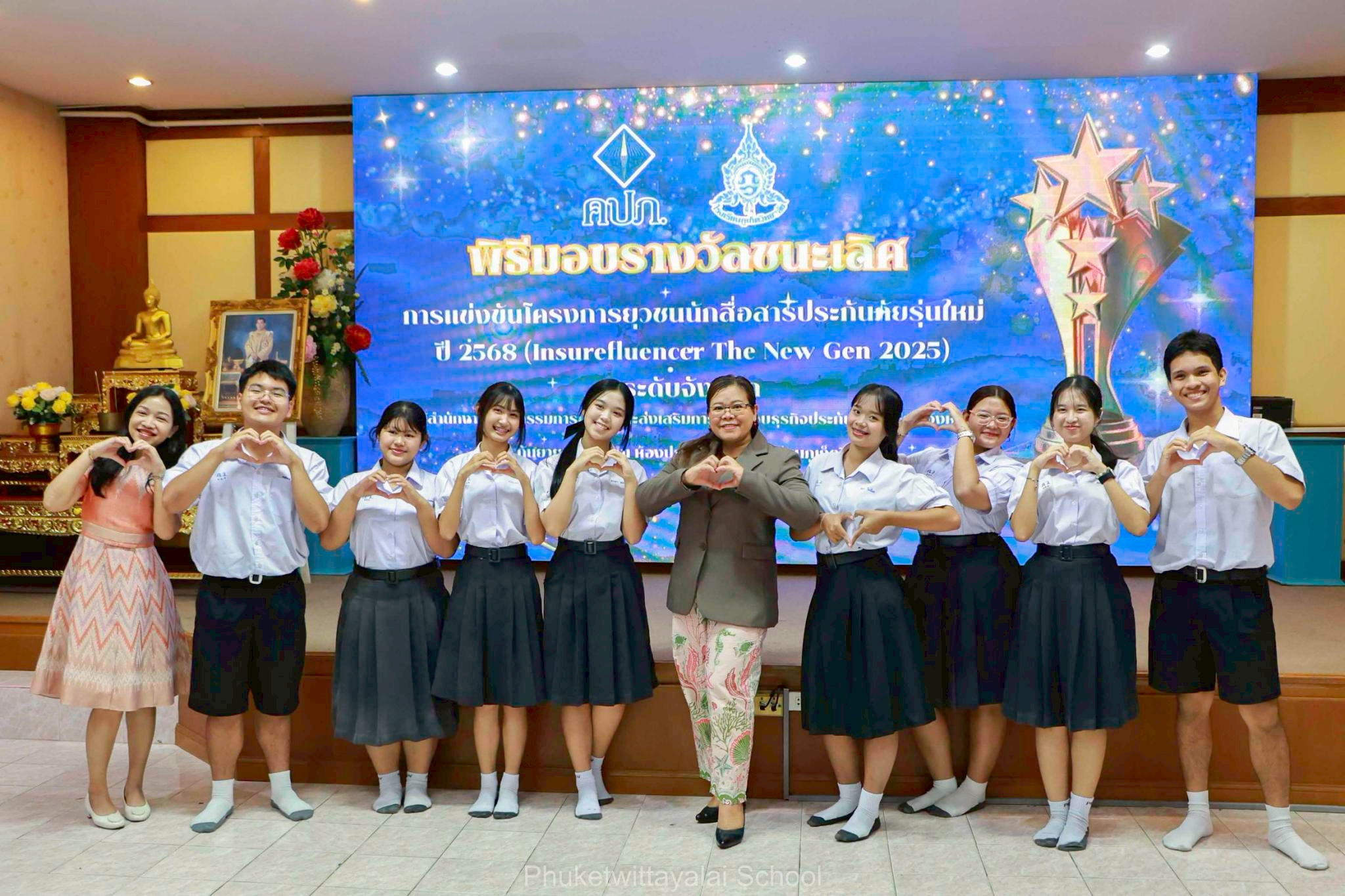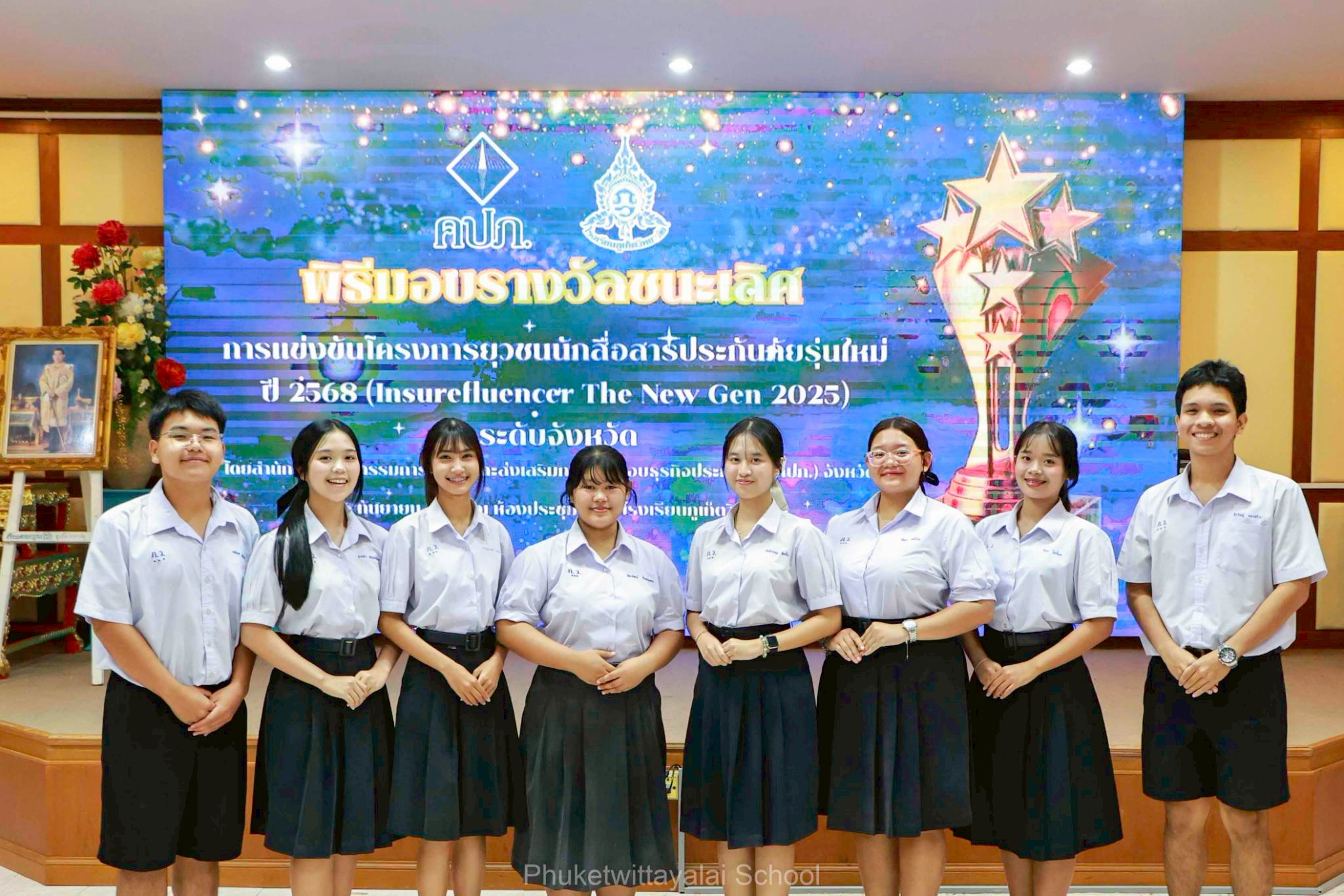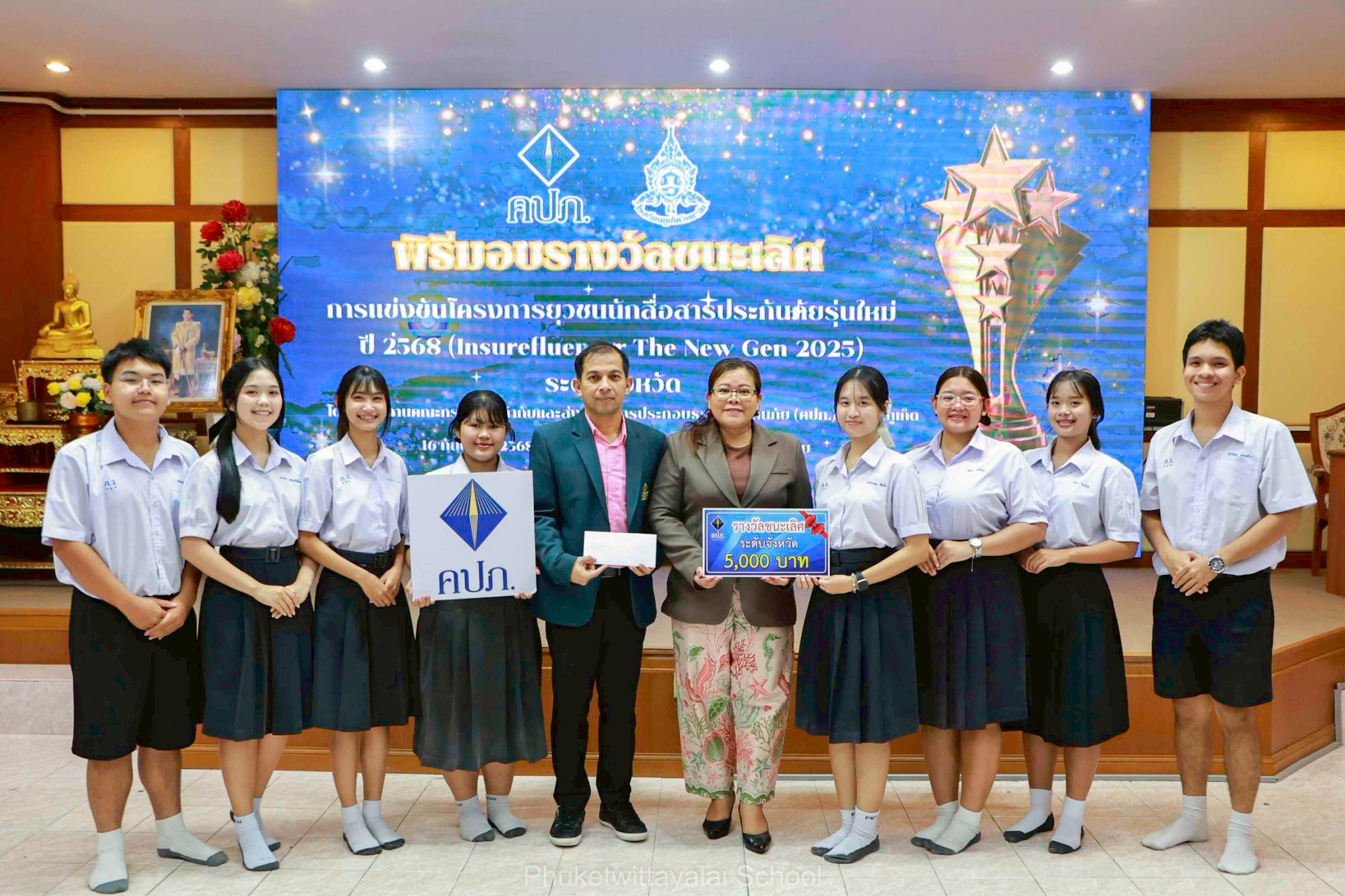 โรงเรียนภูเก็ตวิทยาลัยขอแสดงความชื่นชม ยินดี นักเรียนแกนนำยุวชนนักสื่อสารประกันภัยรุ่นใหม่ โรงเรียนภูเก็ตวิทยาลัย นางสาวกิตติวรรณ อิดทิ่ง ม.6/10นายกฤติพงศ์ เรืองอ่อน ม.6/11 นางสาวธัญดา แซ่โก๊ย ม.6/11นางสาวอารยา ศิริเจริญไชย ม.6/12 นายสิรวิชญ์ ทองสร้าง ม.6/13นางสาวพิมพ์มาดา สงสม ม.6/13 นางสาวอันดา โดะโอย ม.6/14นางสาวธิดารัตน์ จันทร์แดง ม.6/14 รางวัลชนะเลิศ มอบรางวัลทุนพัฒนาการศึกษา 5,000 บาท และเกียรติบัตร การแข่งขันโครงการยุวชนนักสื่อสารประกันภัยรุ่นใหม่ ปี 2568 (Insurefluencer The New Gen 2025) ระดับจังหวัด โดยสำนักงานคณะกรรมการกำกับและส่งเสริมการประกอบธุรกิจประกันภัย (คปภ.) จังหวัดภูเก็ต ครูที่ปรึกษา นางสาวจันทร์จิรา พิมพิลานางสาวซูนีตา สูหลง นายภูมิ ชาลีวัลย์นายนวพนธ์ รอดบุญมี กลุ่มสาระการเรียนรู้สุขศึกษาและพลศึกษา นายชาคริตร์ เพิ่มพูลว่าที่ร้อยหญิงภัทรา เสนากัสป์ นางสาวธนพร ทานัง กลุ่มสาระการเรียนรู้วิทยาศาสตร์และเทคโนโลยี นางสาวทิพย์สุดา รัตนคำ กลุ่มสาระการเรียนรู้คณิตศาสตร์