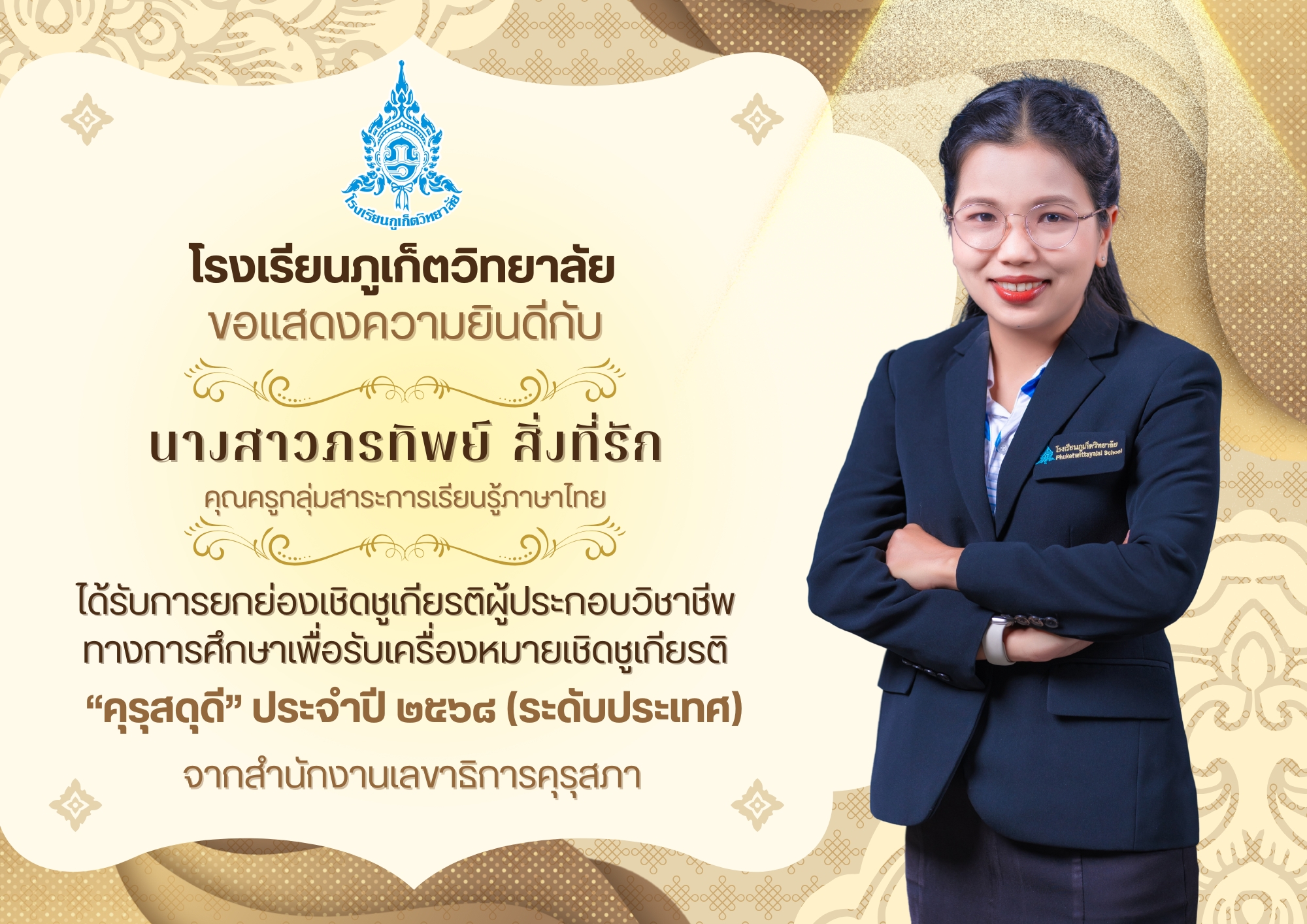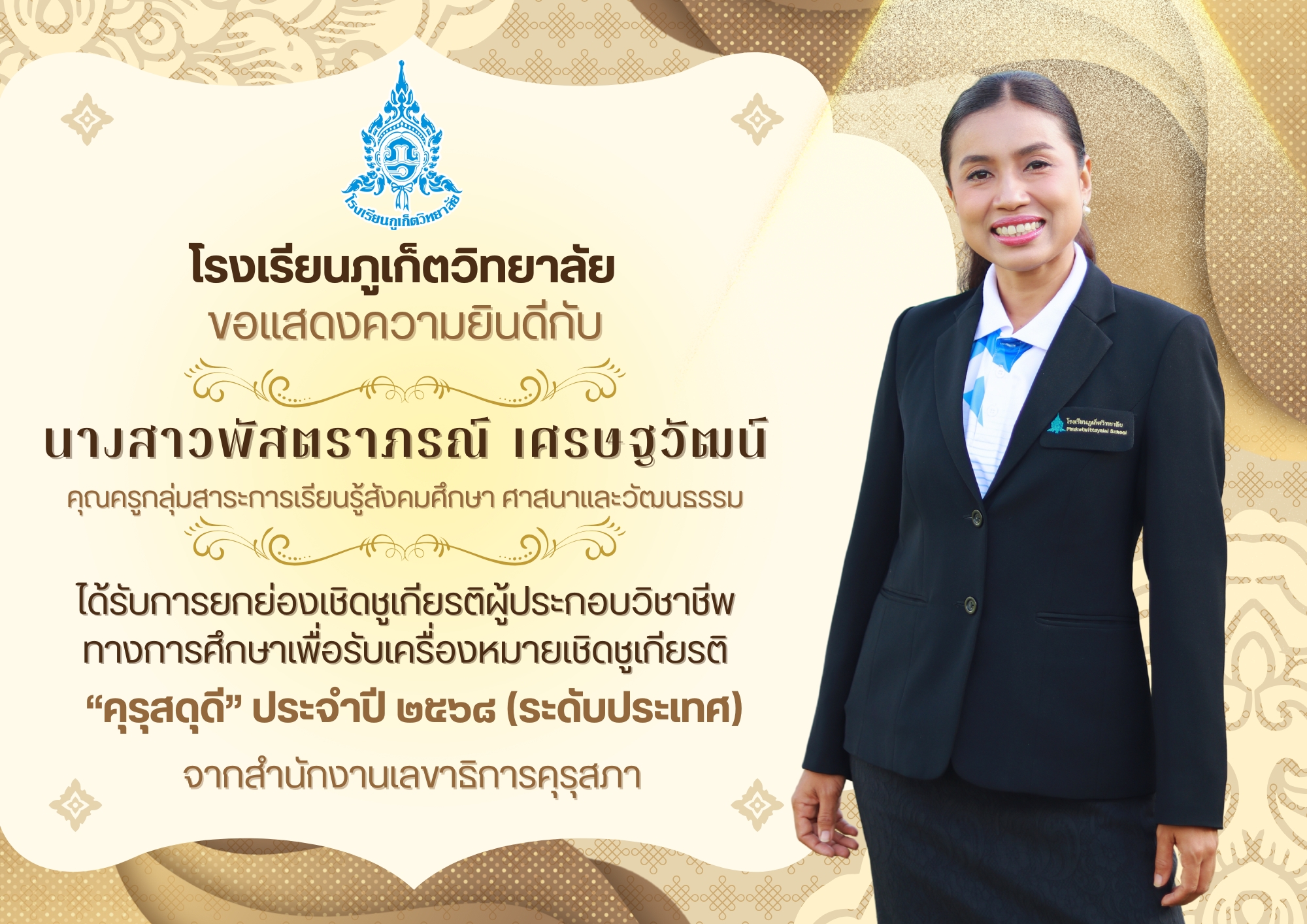 โรงเรียนภูเก็ตวิทยาลัย ยขอแสดงความยินดี นางสาวพัสตราภรณ์ เศรษฐวัฒน์ คุณครูกลุ่มสาระการเรียนรู้สังคมศึกษา ศาสนาและวัฒนธรรม นางสาวภรทิพย์ สิ่งที่รัก คุณครูกลุ่มสาระการเรียนรู้ภาษาไทย ได้รับการยกย่องเชิดชูเกียรติผู้ประกอบวิชาชีพทางการศึกษา เพื่อรับเครื่องหมายเชิดชูเกียรติ “คุรุสดุดี” ประจำปี ๒๕๖๘ ระดับประเทศ โดยสำนักงานเลขาธิการคุรุสภา
