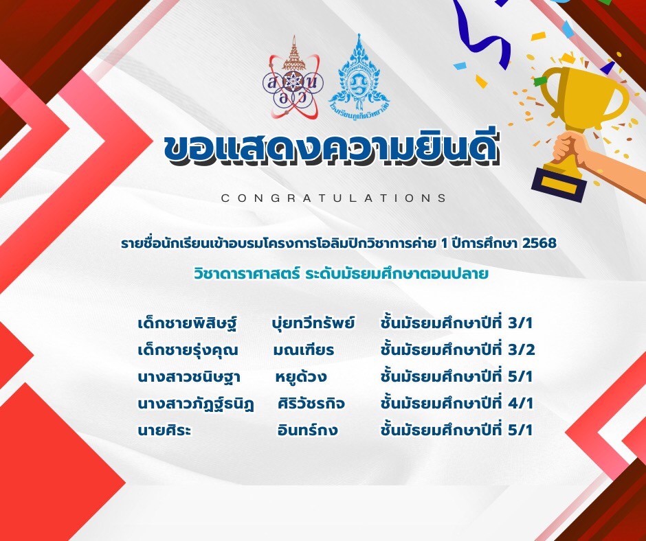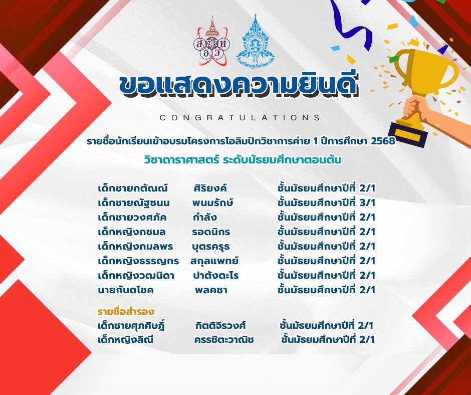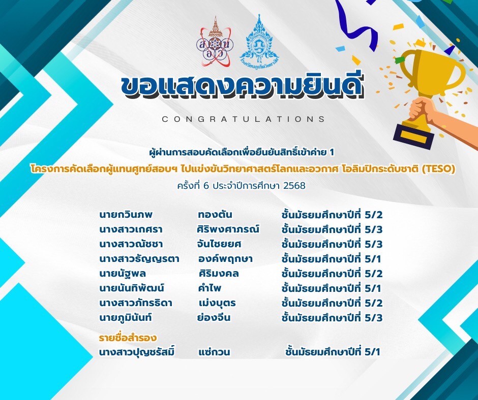 โรงเรียนภูเก็ตวิทยาลัยขอแสดงความชื่นชม ยินดี นักเรียนโรงเรียนภูเก็ตวิทยาลัย ผ่านการสอบคัดเลือก เพื่อยืนยันสิทธิ์เข้าค่าย 1 โครงการคัดเลือกผู้แทนศูนย์สอบฯ ไปแข่งขันวิทยาศาสตร์โลกและอวกาศ ครั้งที่ 6 ประจำปีการศึกษา 2568 ผ่านการสอบคัดเลือก เพื่อเข้าร่วมโครงการ สอวน. ค่าย 1 ประจำปีการศึกษา 2568 วิชาดาราศาสตร์