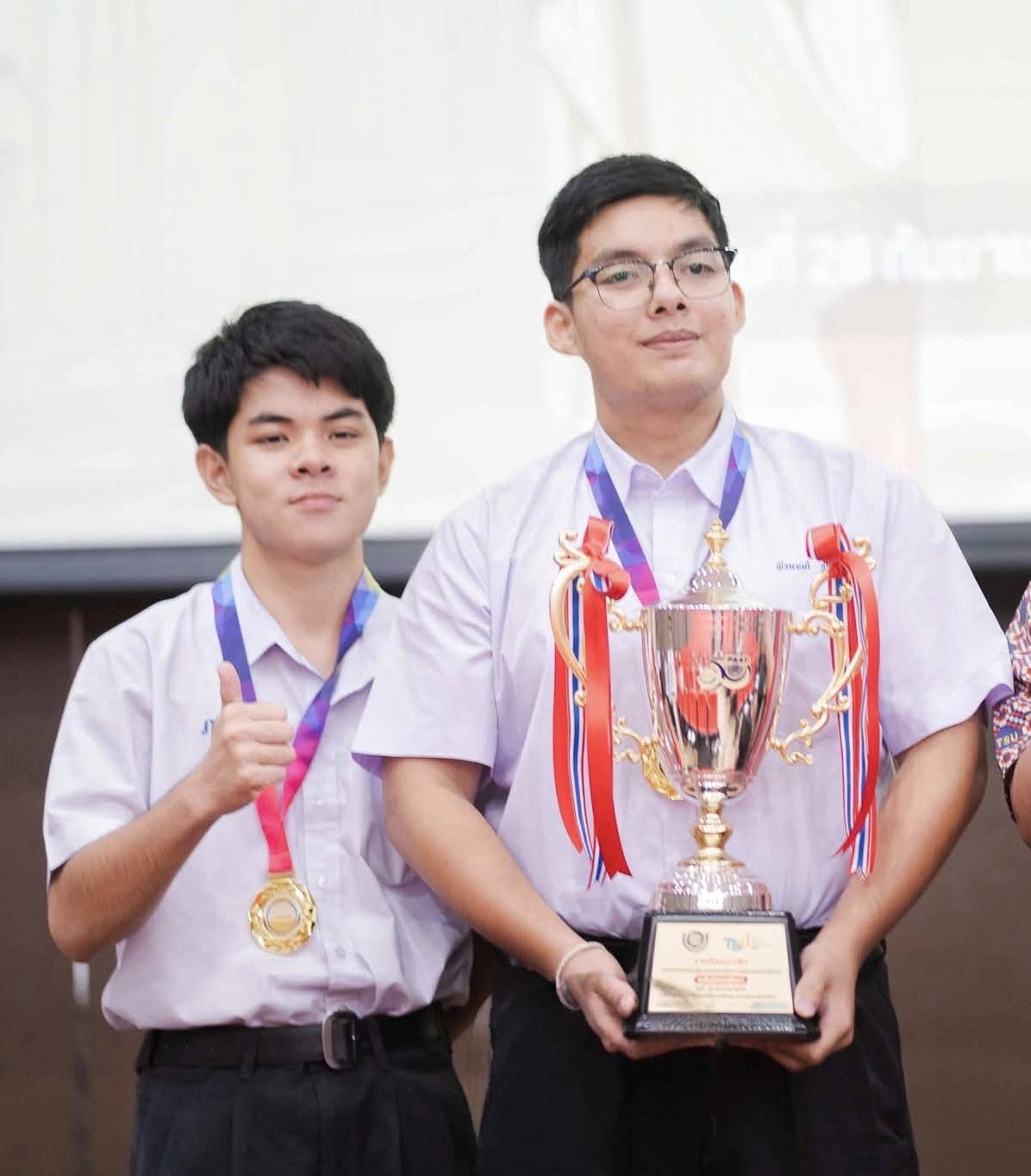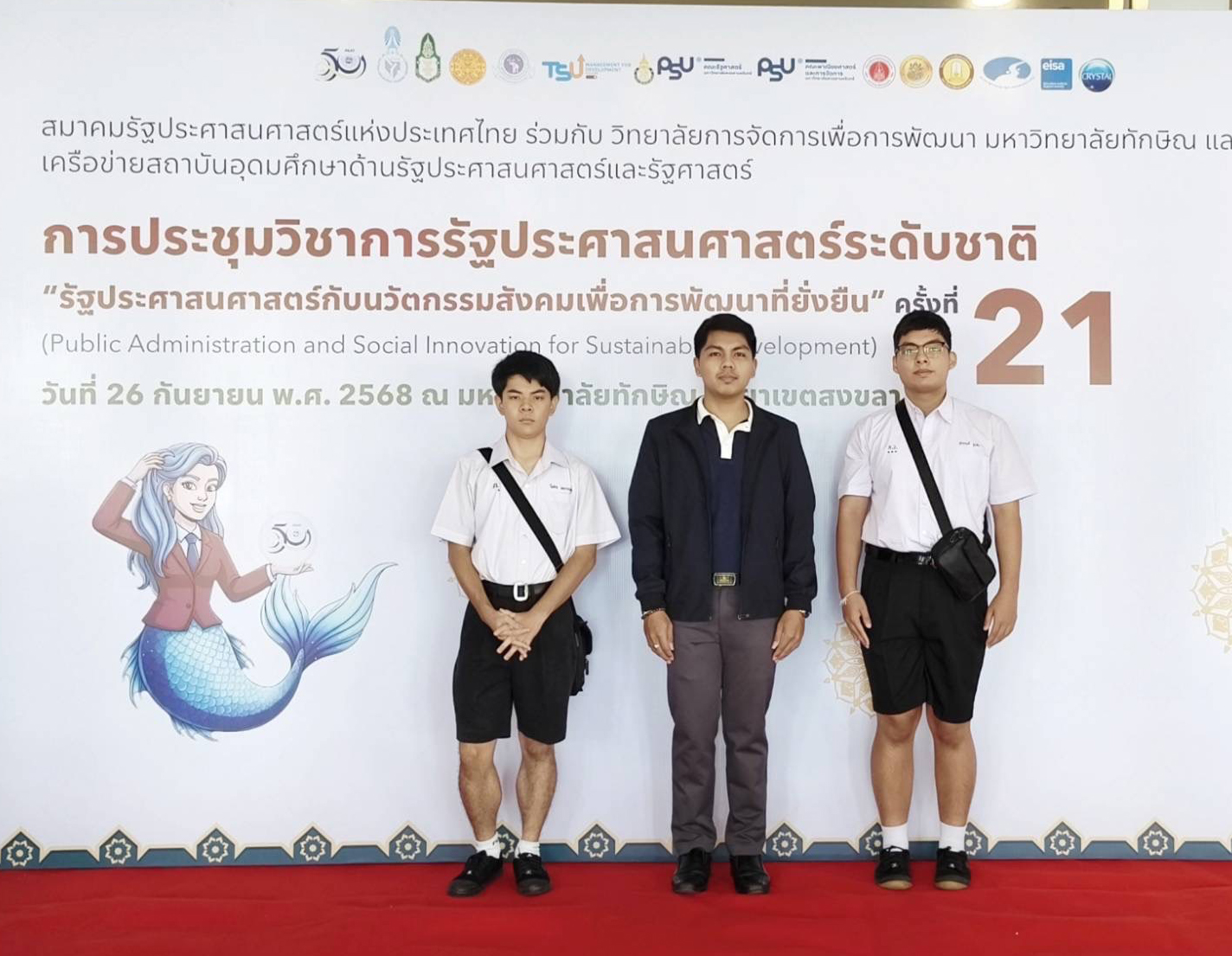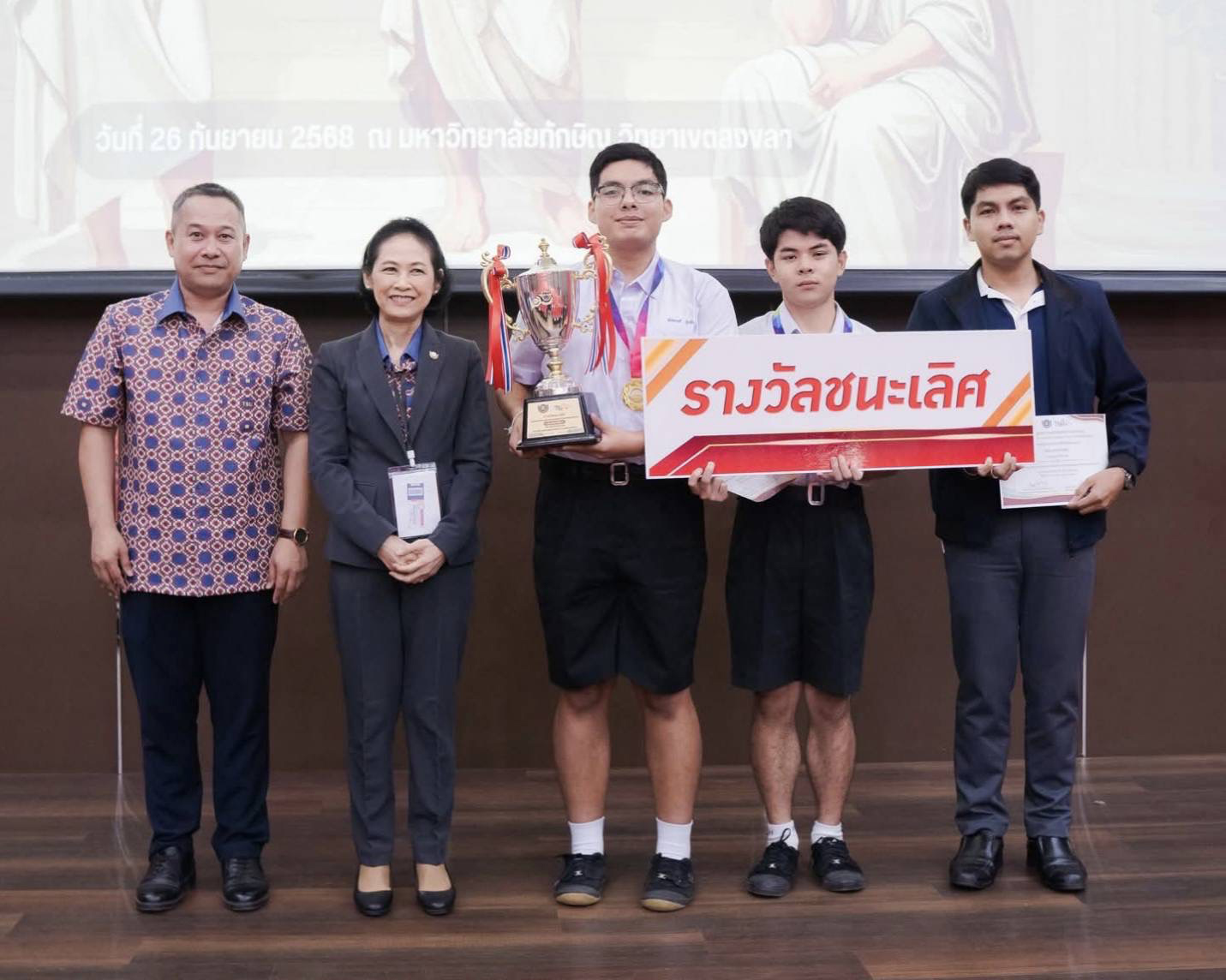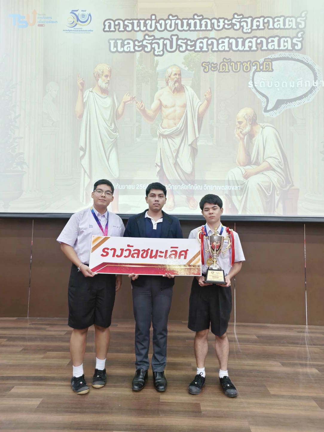 รางวัลชนะเลิศ รับถ้วยรางวัล เหรียญรางวัล พร้อมเงินรางวัล จาก ศาสตราจารย์ ดร.อัมพร ธำรงลักษณ์ นายกสมาคมรัฐประศาสนศาสตร์แห่งประเทศไทย การแข่งขัน “ทักษะทางรัฐศาสตร์และรัฐประศาสนศาสตร์ ระดับมัธยมศึกษา ระดับชาติ ประจำปี 2568" จัดโดย สมาคมรัฐประศาสนศาสตร์แห่งประเทศไทย ร่วมกับ วิทยาลัยการจัดการเพื่อการพัฒนา มหาวิทยาลัยทักษิณ และเครือข่ายสถาบันอุดมศึกษาด้านรัฐประศาสนศาสตร์และรัฐศาสตร์ วันที่ 26 กันยายน 2568 ณ มหาวิทยาลัยทักษิณ วิทยาเขตสงขลา ครูผู้ฝึกซ้อม นายเทิดธรรม ศรีสว่าง กลุ่มสาระการเรียนรู้สังคมศึกษา ศาสนาและวัฒนธรรม