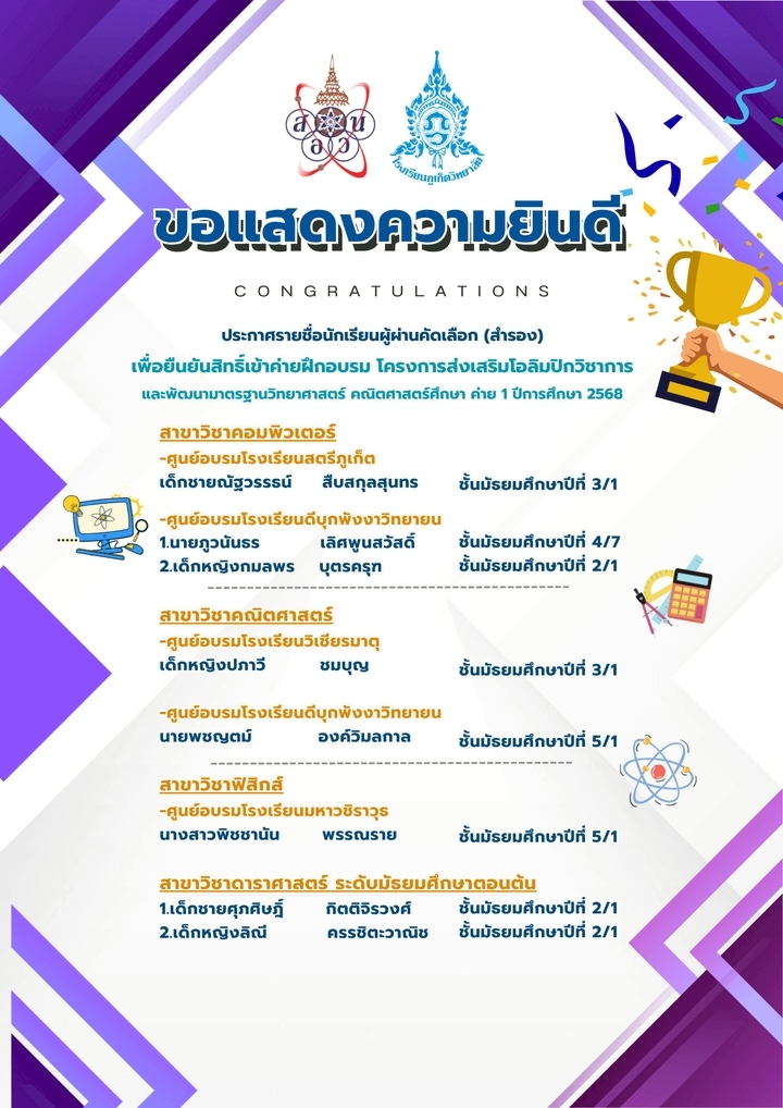 โรงเรียนภูเก็ตวิทยาลัยขอแสดงความชื่นชม ยินดี นักเรียนโรงเรียนภูเก็ตวิทยาลัย ที่ผ่านการสอบคัดเลือก (สำรอง) เพื่อยืนยันสิทธิ์เข้าค่ายฝึกอบรม โครงการส่งเสริมโอลิมปิกวิชาการและพัฒนามาตรฐานวิทยาศาสตร์ คณิตศาสตร์ศึกษา ค่าย 1 ปีการศึกษา 2568