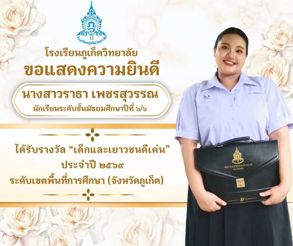 โรงเรียนภูเก็ตวิทยาลัย ขอแสดงความยินดี นางสาวราธา เพชรสุวรรณ มัธยมศึกษาปีที่ ๖/๖ รับรางวัล "เด็กและเยาวชนดีเด่น" ประจำปี ๒๕๖๙ ระดับเขตพื้นที่การศึกษา (จังหวัดภูเก็ต)