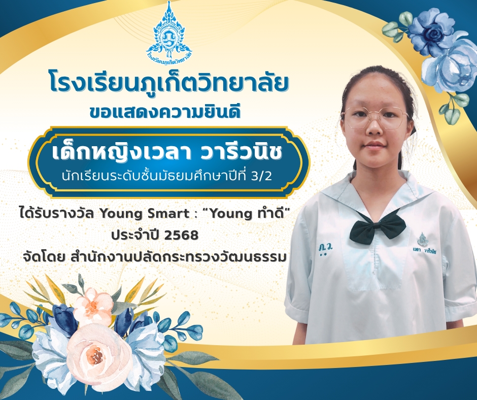 โรงเรียนภูเก็ตวิทยาลัย ขอแสดงความยินดี เด็กหญิงเวลา วารีวนิช ชั้นมัธยมศึกษาปีที่ 3/2 รับรางวัล Young Smart : “Young ทำดี” ประจำปี 2568 จัดโดย สำนักงานปลัดกระทรวงวัฒนธรรม