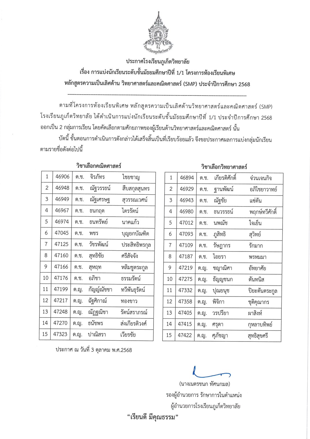 โรงเรียนภูเก็ตวิทยาลัย เรื่อง การแบ่งนักเรียนระดับชั้นมัธยมศึกษาปีที่ 1/1 โครงการห้องเรียนพิเศษ หลักสูตรความเป็นเลิศด้านวิทยาศาสตร์และคณิตศาสตร์ (SMP) ประจำปีการศึกษา 2568