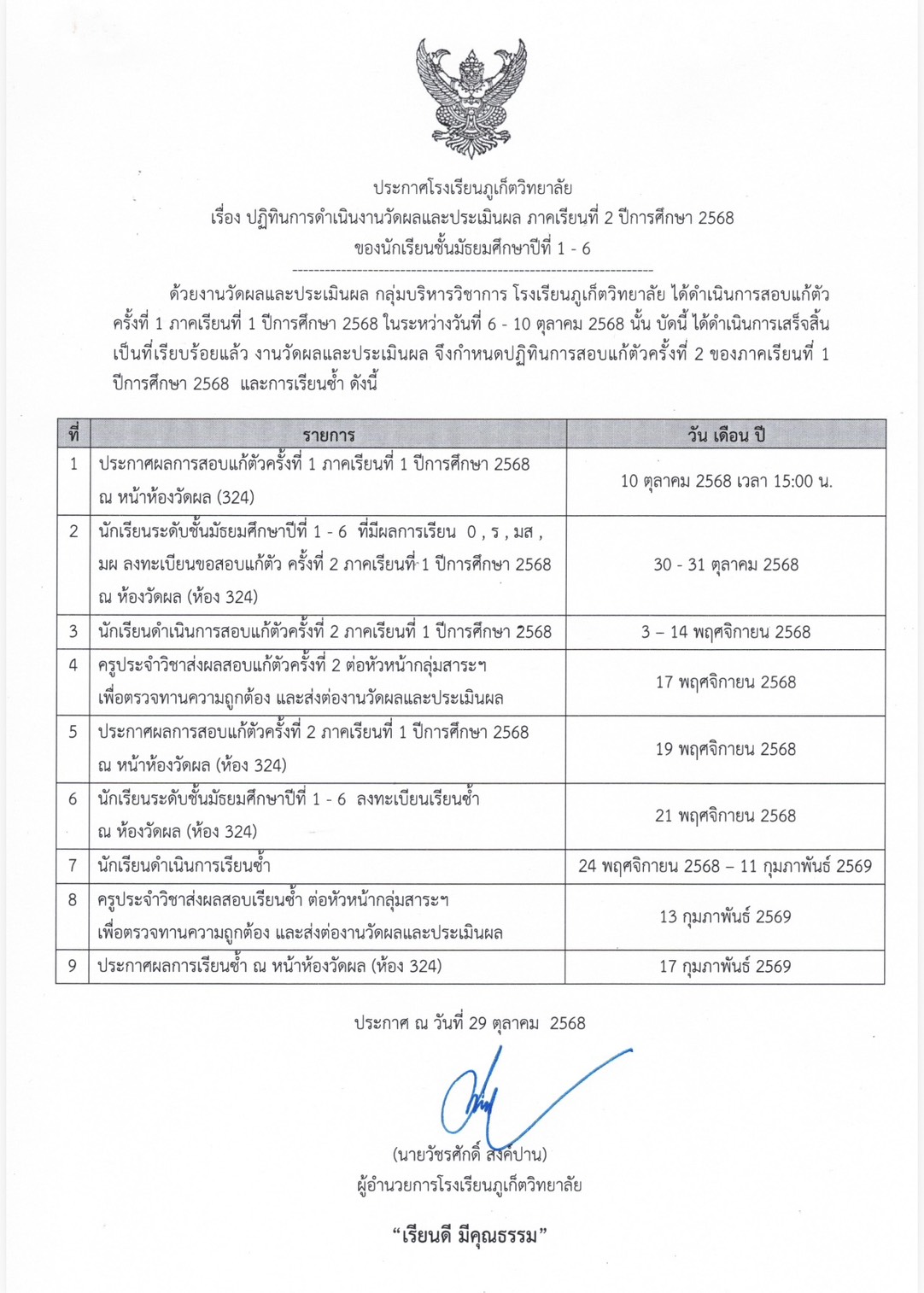 โรงเรียนภูเก็ตวิทยาลัย เรื่อง ปฏิทินการดำเนินงานวัดผลและประเมินผล ภาคเรียนที่ 2 ปีการศึกษา 2568 ของนักเรียนชั้นมัธยมศึกษาปีที่ 1 - 6