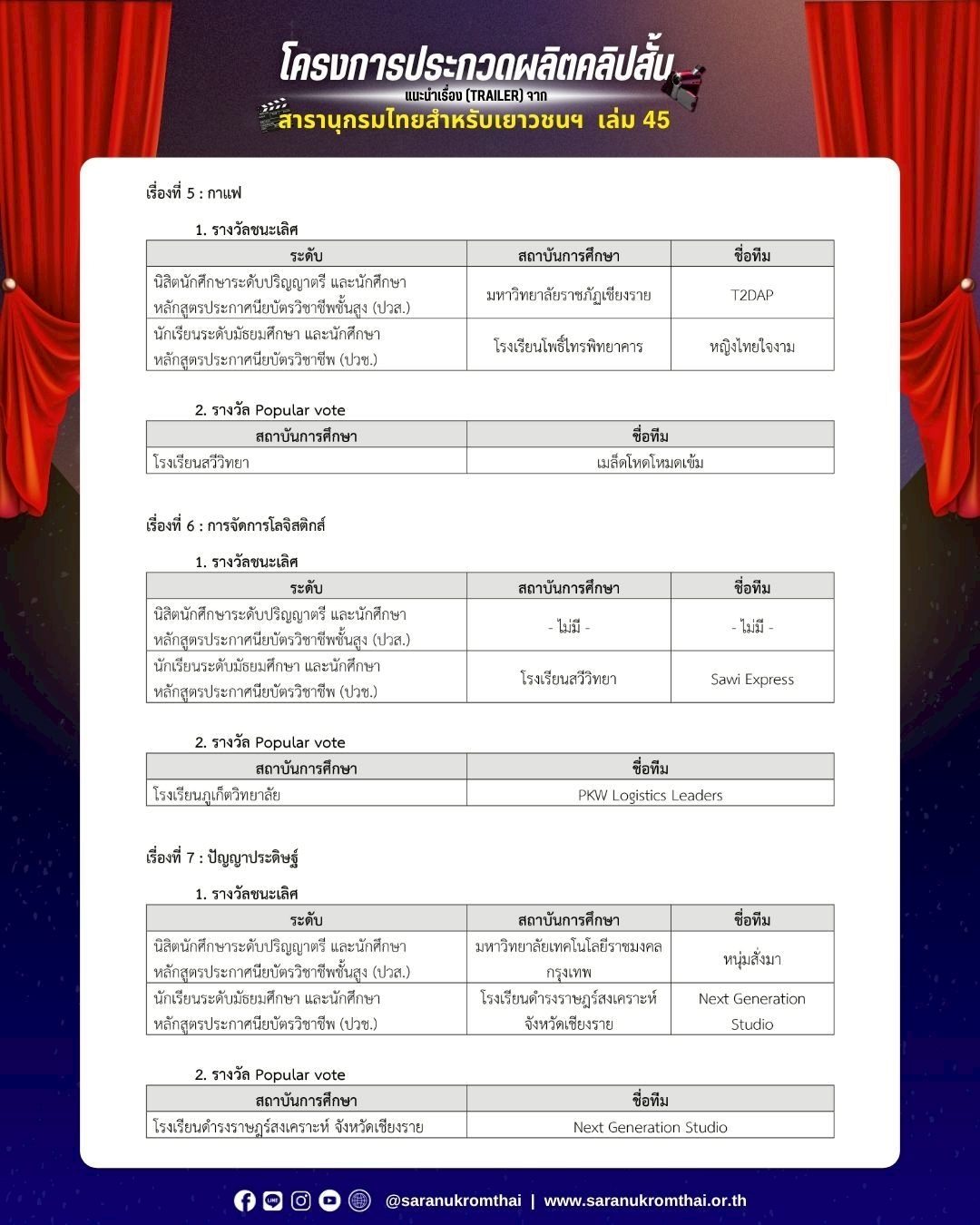 รางวัล Popular Vote สารานุกรมไทยสำหรับเยาวชนฯ เล่ม 45 เรื่องที่ 6 : การจัดการโลจิสติกส์ รับเกียรติบัตรและเงินรางวัล 5,000 บาท การแข่งขันโครงการประกวดผลิตคลิปสั้นแนะนำเรื่อง (Trailer) จากสารานุกรมไทยสำหรับเยาวชนฯ เล่ม 45 จัดโดย มูลนิธิโครงการสารานุกรมไทยสำหรับเยาวชน โดยพระราชประสงค์ในพระบาทสมเด็จพระบรมชนกาธิเบศร มหาภูมิพลอดุลยเดชมหาราช บรมนาถบพิตร ครูที่ปรึกษา นางสาวพัสตราภรณ์ เศรษฐวัฒน์ กลุ่มสาระการเรียนรู้สังคมศึกษา ศาสนาและวัฒนธรรม