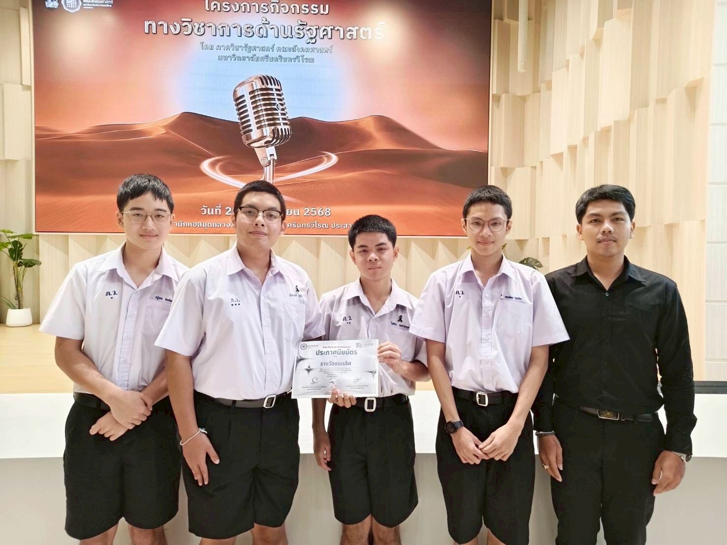 นายปฏิพน สิทธิผล ม.4/9นายจตุรภัทร จรุงจิตร ม.4/11 โรงเรียนภูเก็ตวิทยาลัยทีม B เข้าสู่รอบชิงชนะเลิศ รับเกียรติบัตร (10 ทีมสุดท้าย จากผู้ผ่านเข้ารอบการคัดเลือก 50 ทีม) การแข่งขัน “ตอบปัญหาวิชาการทางรัฐศาสตร์ ระดับมัธยมศึกษาตอนปลาย" โครงการกิจกรรมทางวิชาการด้านรัฐศาสตร์ ประจำปี 2568 จัดโดย ภาควิชารัฐศาสตร์ คณะสังคมศาสตร์ มหาวิทยาลัยศรีนครินทรวิโร (ประสานมิตร) ครูผู้ฝึกซ้อม นายเทิดธรรม ศรีสว่าง กลุ่มสาระการเรียนรู้สังคมศึกษา ศาสนาและวัฒนธรรม
