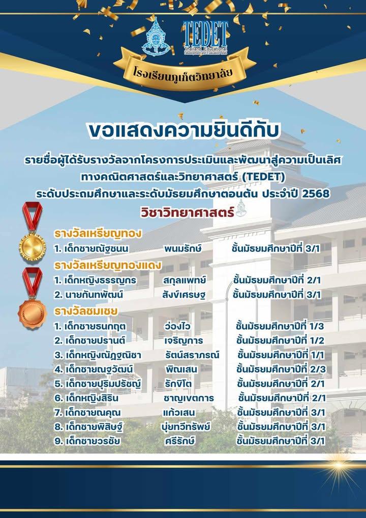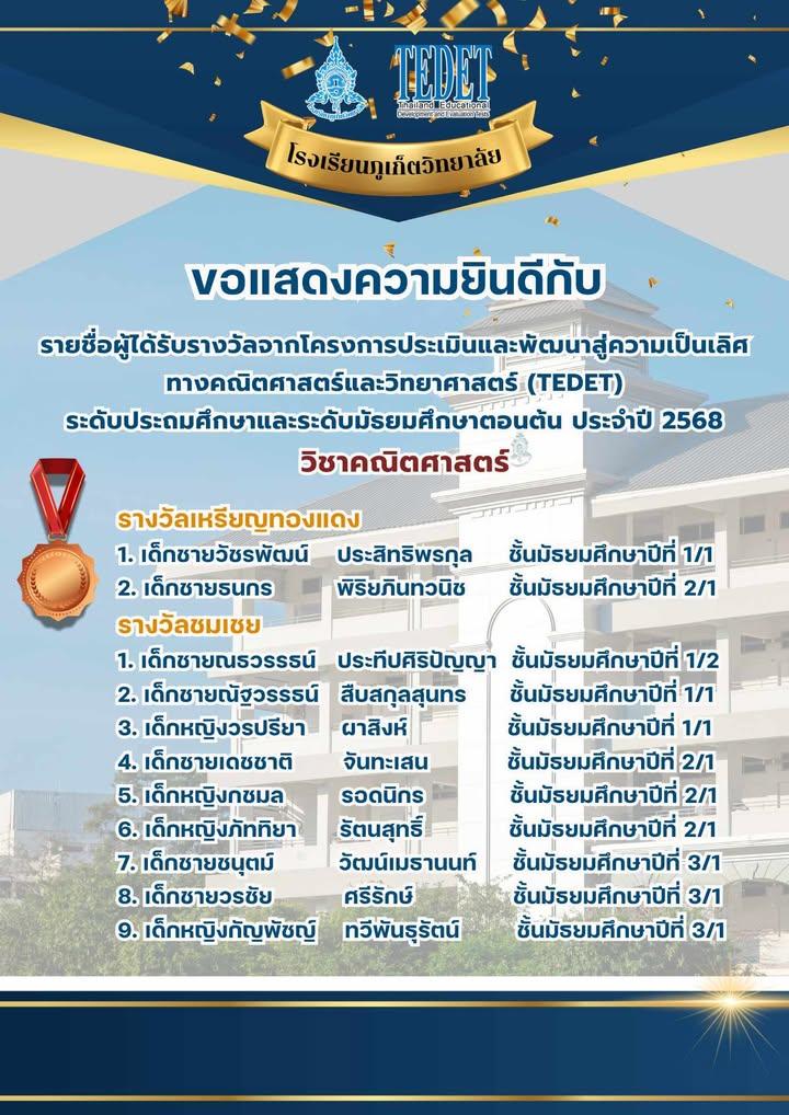 โรงเรียนภูเก็ตวิทยาลัย ขอแสดงความยินดี นักเรียนโรงเรียนภูเก็ตวิทยาลัย ที่ได้รับรางวัลจากโครงการประเมินและพัฒนาสู่ความเป็นเลิศทางคณิตศาสตร์และวิทยาศาสตร์ (TEDET) ระดับประถมศึกษาและมัธยมศึกษาตอนต้น ประจำปี 2568