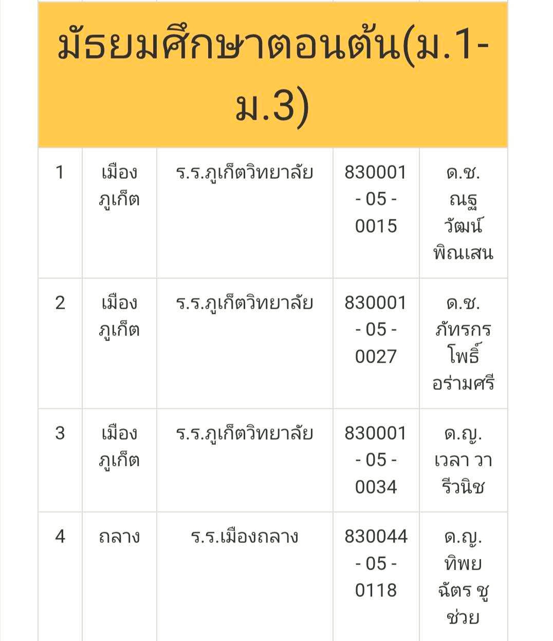 โรงเรียนภูเก็ตวิทยาลัยขอแสดงความชื่นชม ยินดี เด็กชายภัทรกร โพธิ์อร่ามศรี ม.1/2เด็กชายณฐวัฒน์ พิณเสน ม.2/3 เด็กหญิงเวลา วารีวนิช ม.3/2 ระดับมัธยมศึกษาตอนต้น