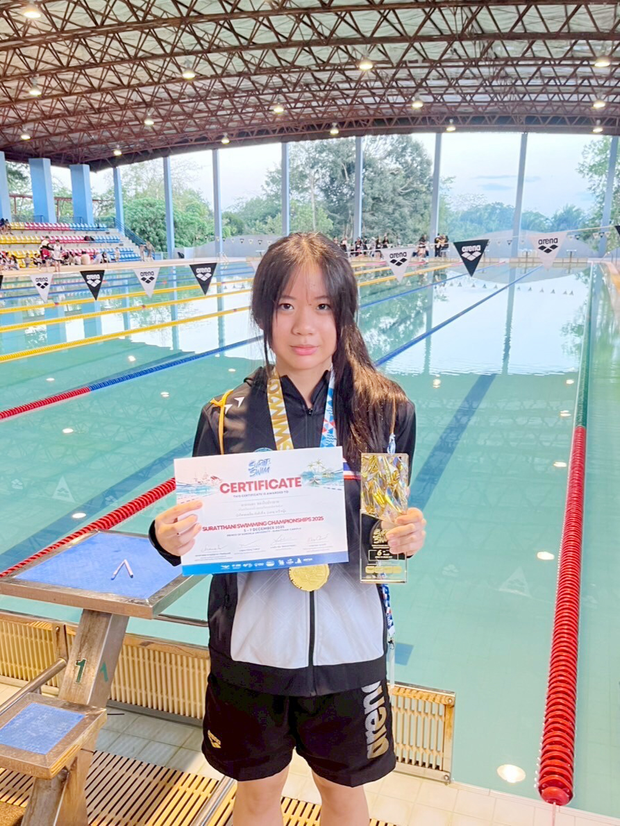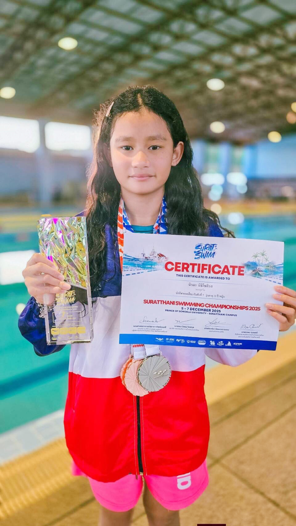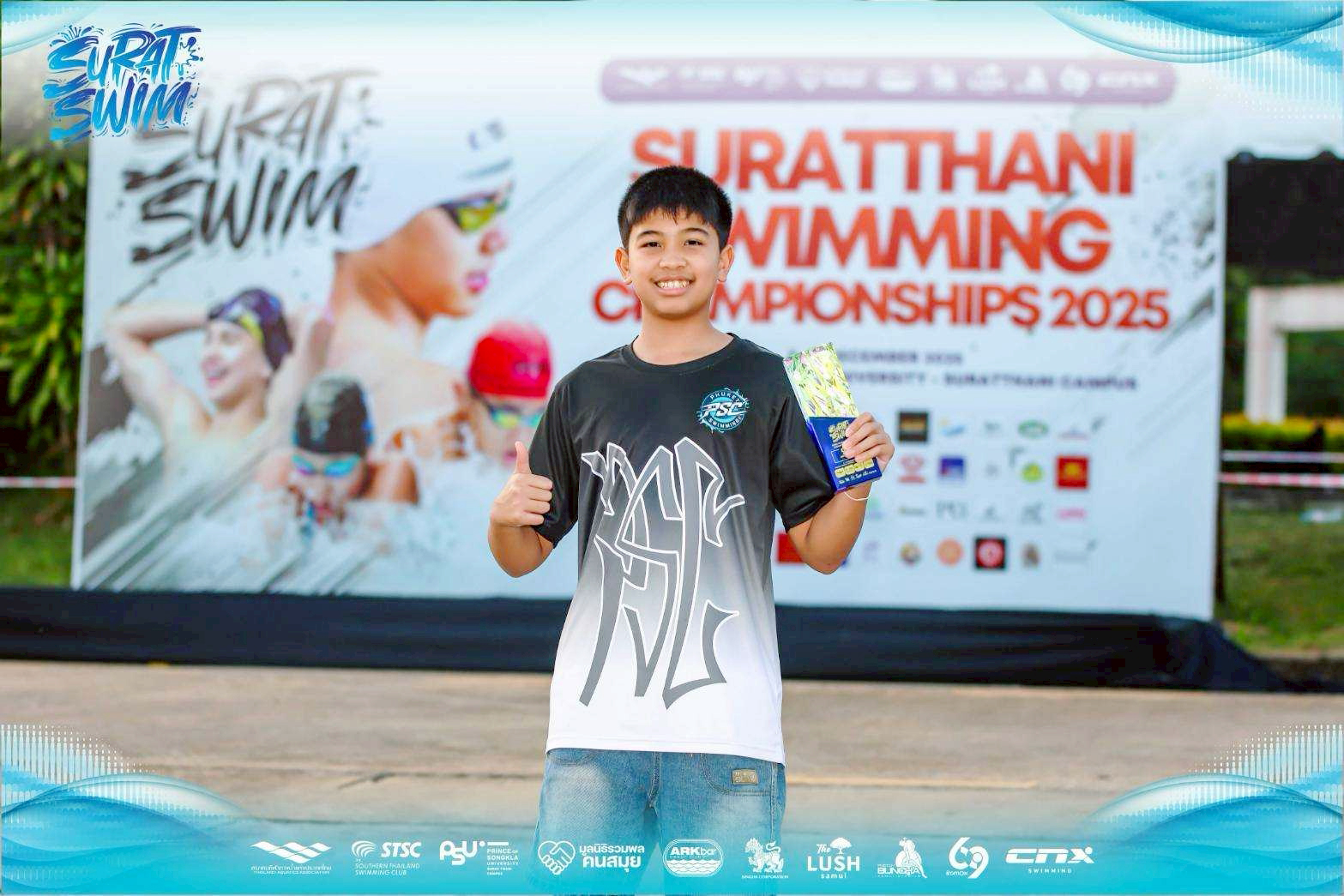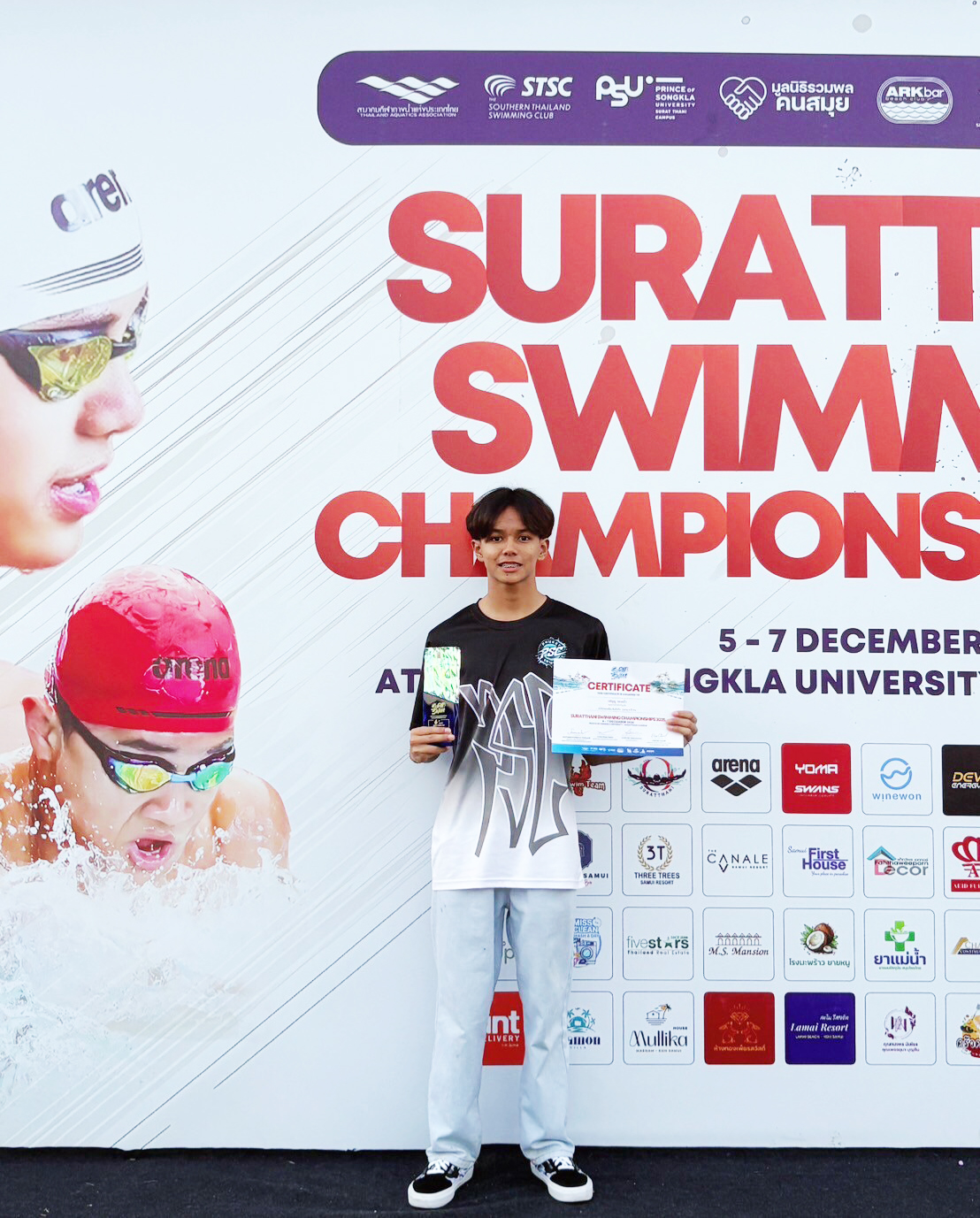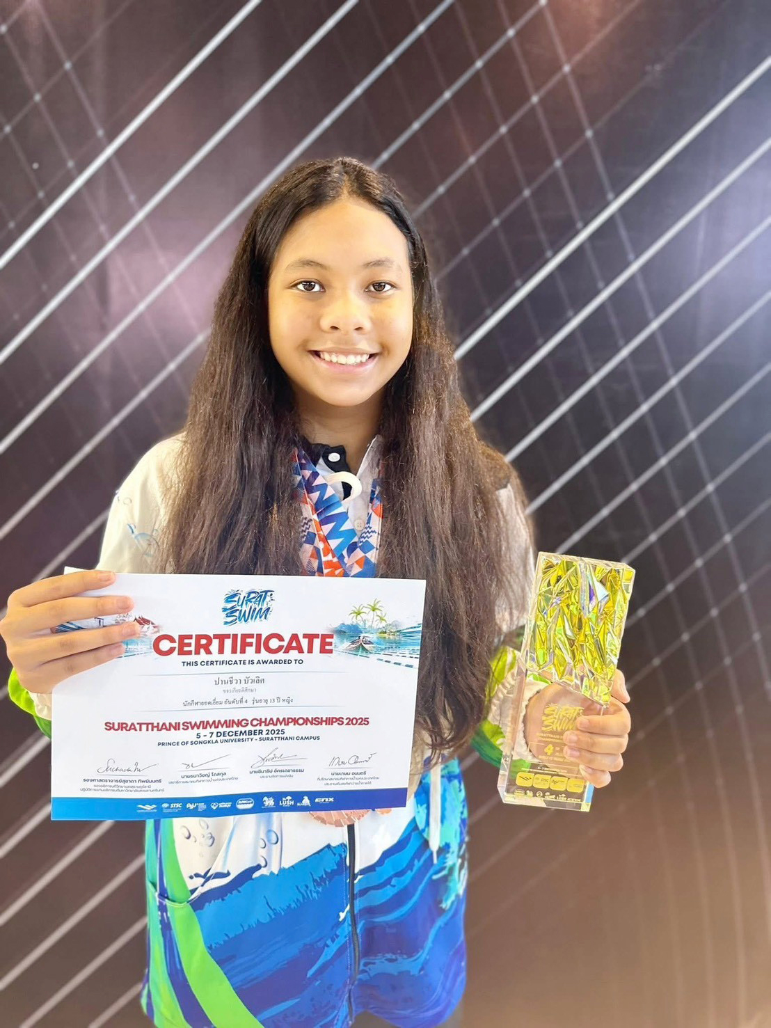 ด.ช.พฤกษ์ เพิ่มหรรษา ม.2/5 รับถ้วยรางวัลนักกีฬายอดเยี่ยมอันดับที่ 9 รุ่น 13 ปีชาย 1 เหรียญทองแดง การแข่งขันว่ายน้ำ สุราษฎร์ธานี สวิมมิ่ง แชมป์เปี้ยนชิพ 2025 ระหว่างวันที่ 5 - 7 ธันวาคม 2568 ณ สระว่ายน้ำ ศูนย์กีฬาและสุขภาพ มหาวิทยาลัยสงขลานครินทร์ วิทยาเขตสุราษฎร์ธานี