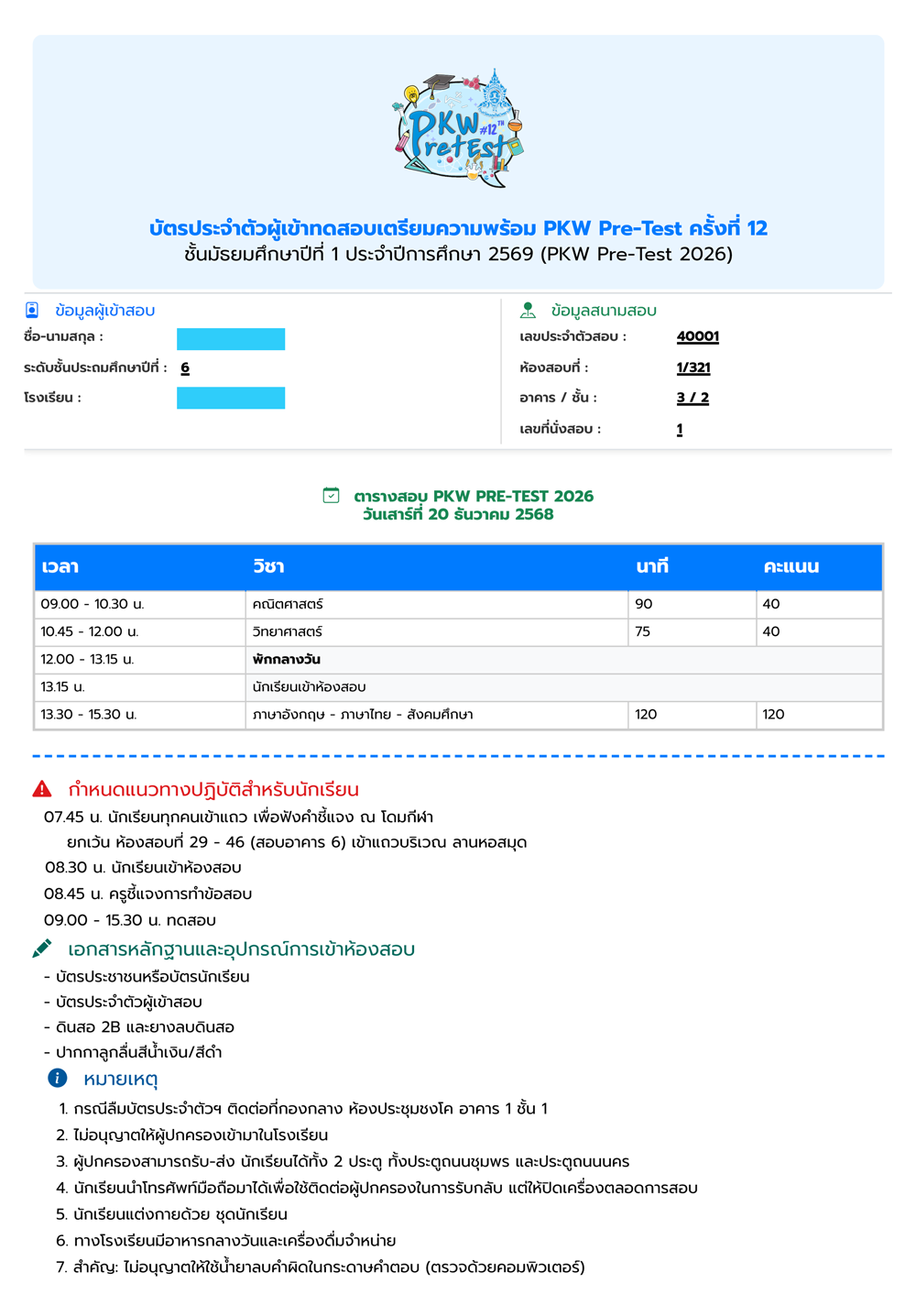 เรื่อง: บัตรประจำตัวผู้เข้าสอบ PKW PRE-TEST 2026 ครั้งที่ 12 ประจำปีการศึกษา 2569