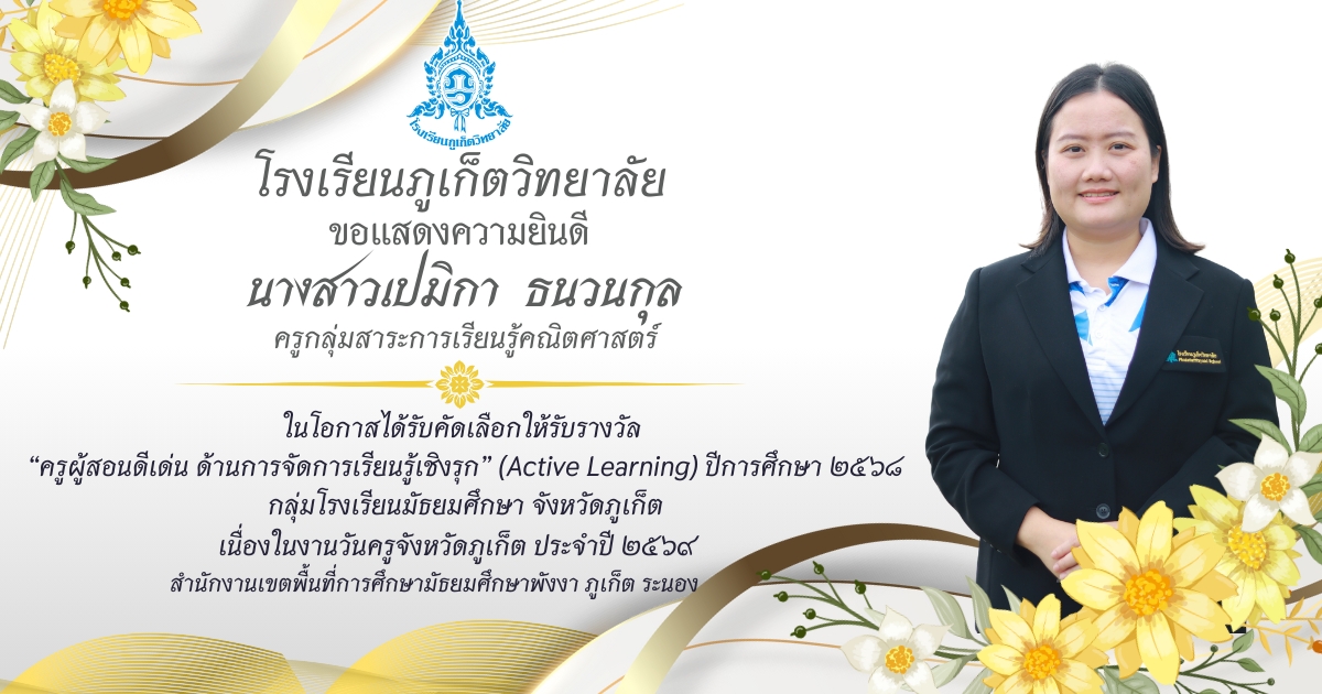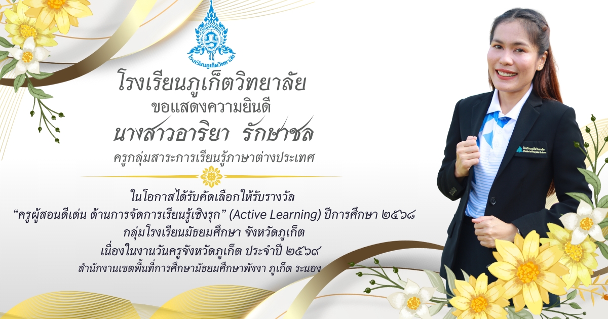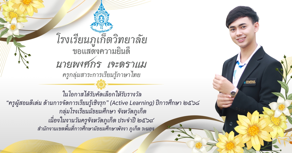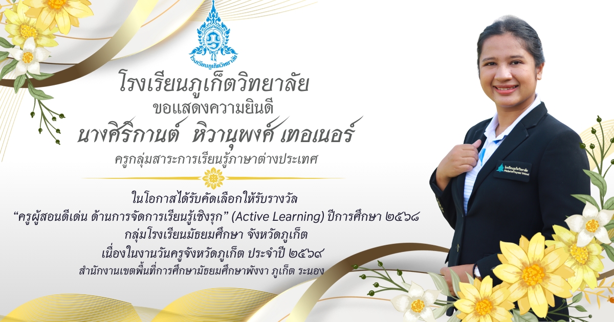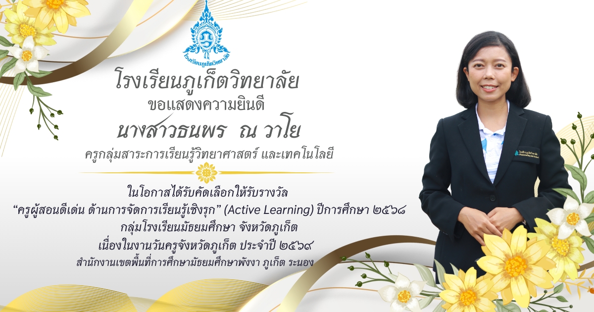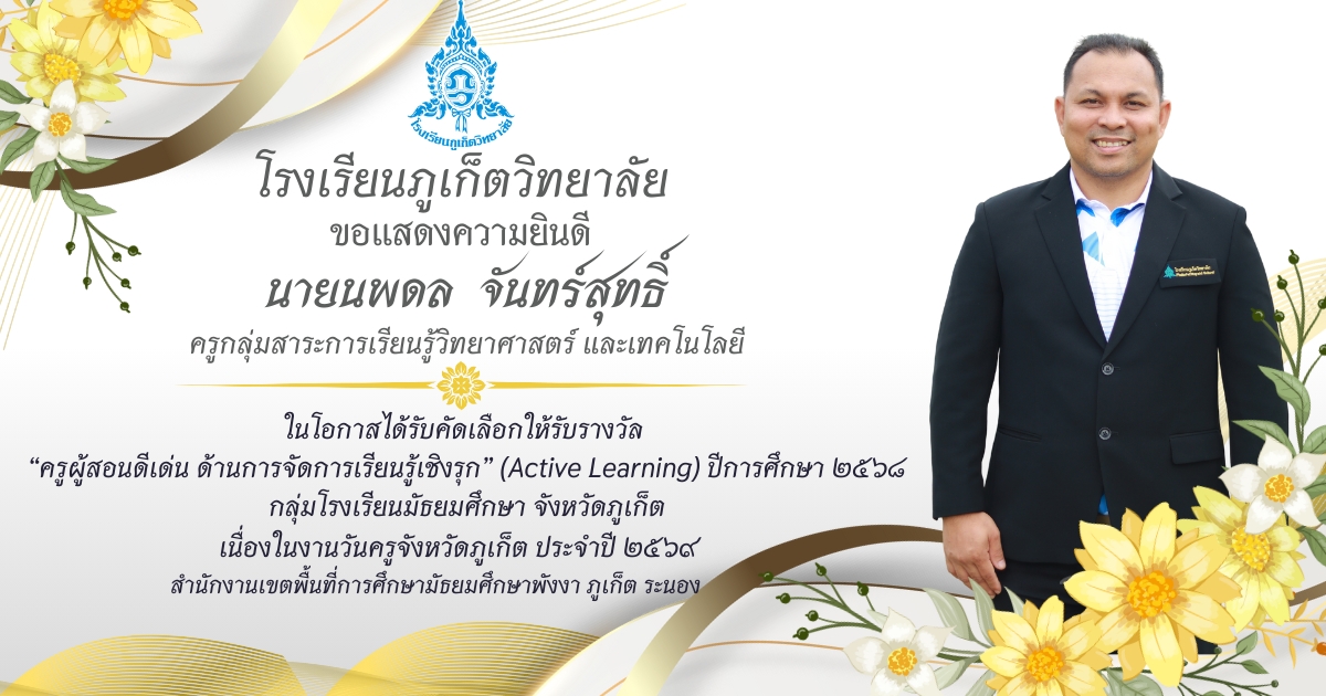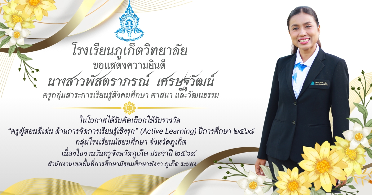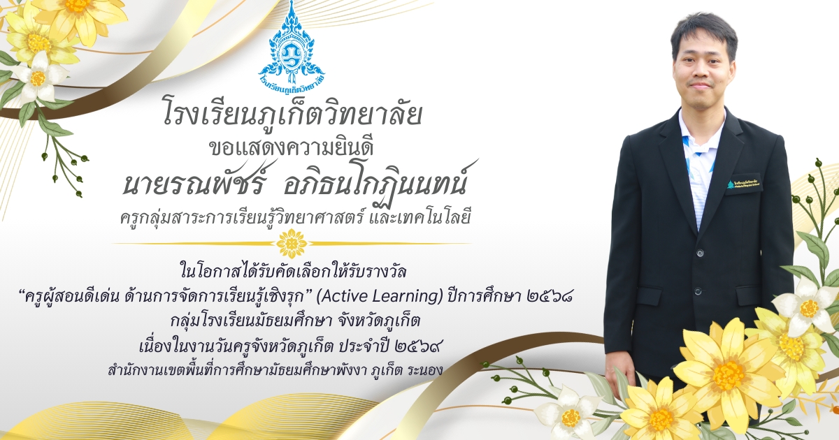 โรงเรียนภูเก็ตวิทยาลัย ยขอแสดงความยินดี ขอแสดงความยินดีกับ คณะครูและบุคลากรที่ได้รับการคัดเลือก เพื่อรับรางวัล “ครูผู้สอนดีเด่น ด้านการจัดการเรียนรู้เชิงรุก (Active Learning)” ประจำปี ๒๕๖๘ กลุ่มโรงเรียนมัธยมศึกษา จังหวัดภูเก็ต เนื่องในงานวันครูจังหวัดภูเก็ต ประจำปี ๒๕๖๙