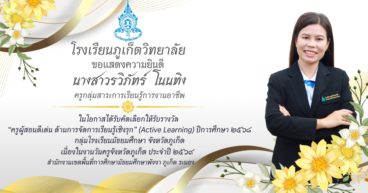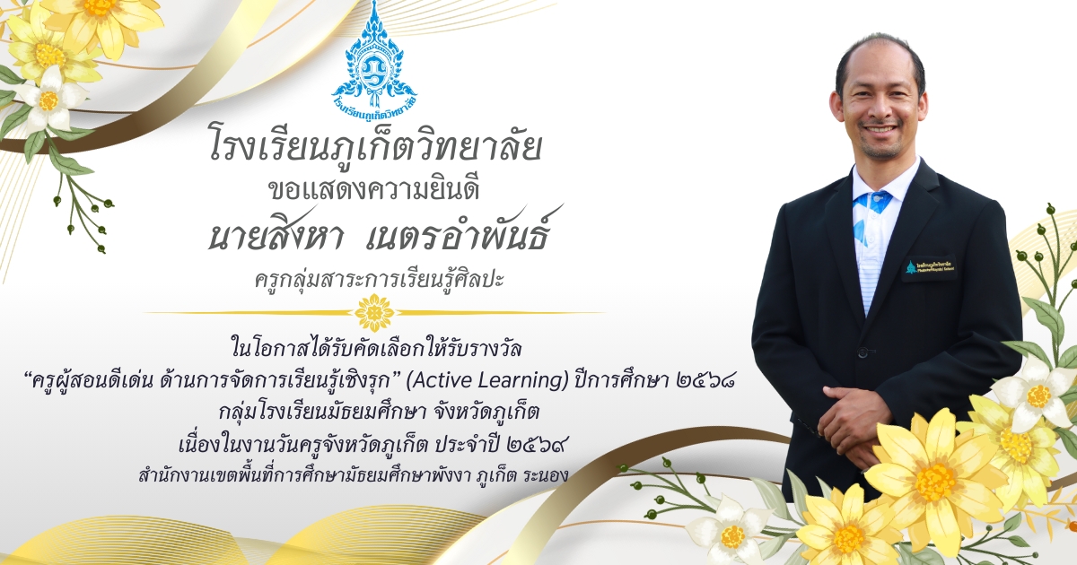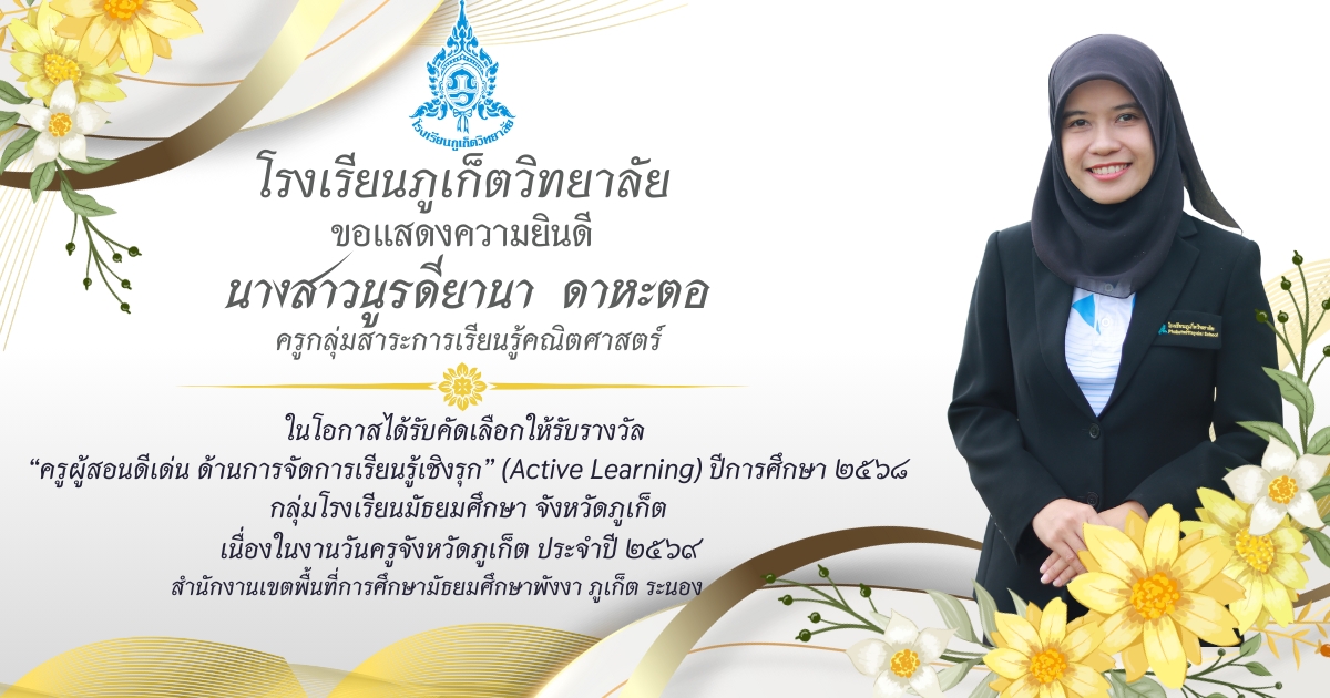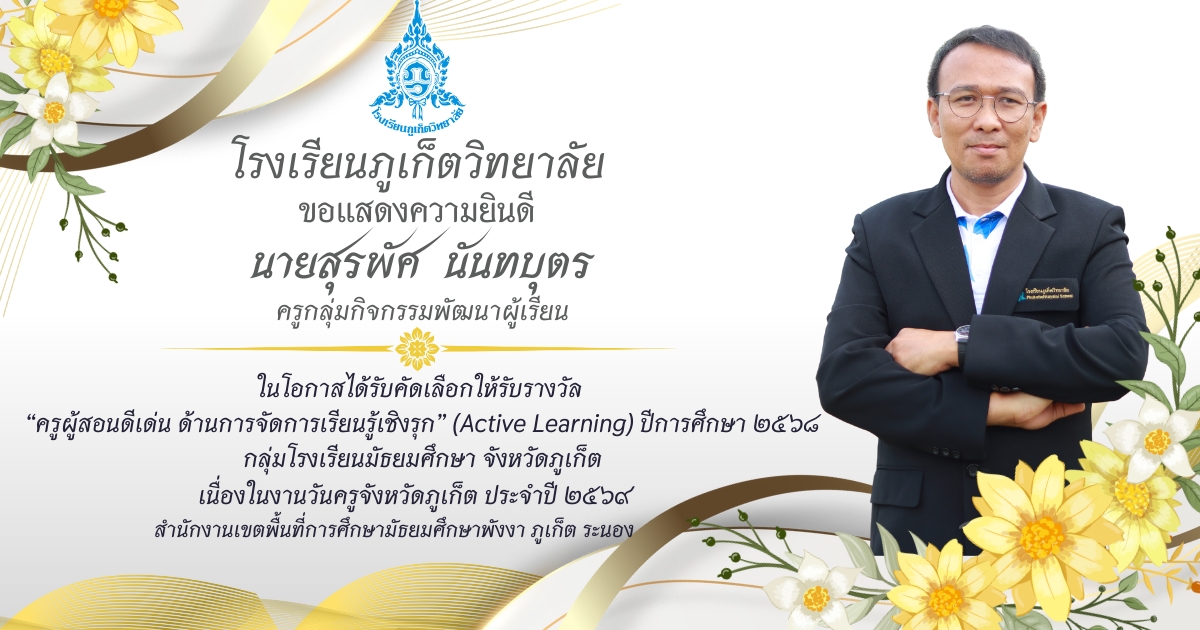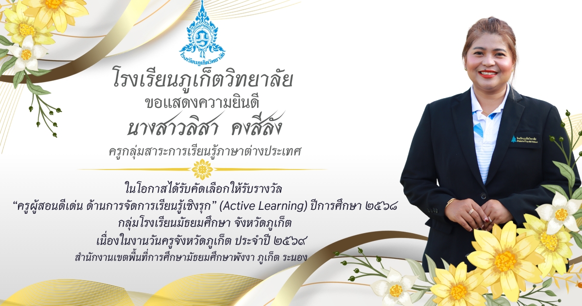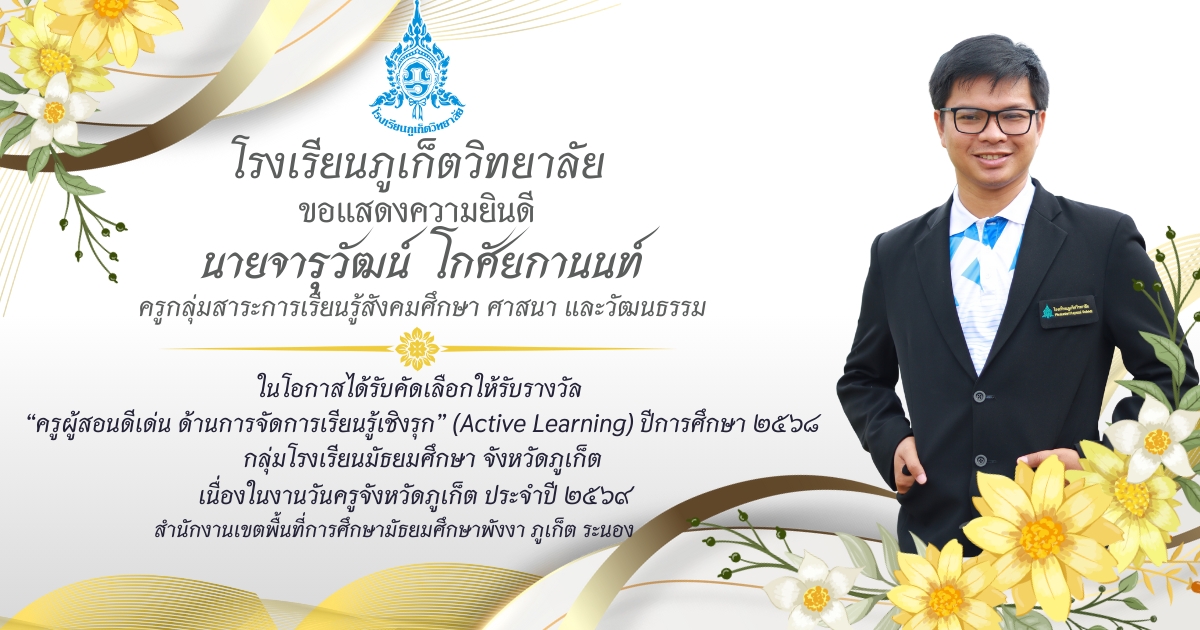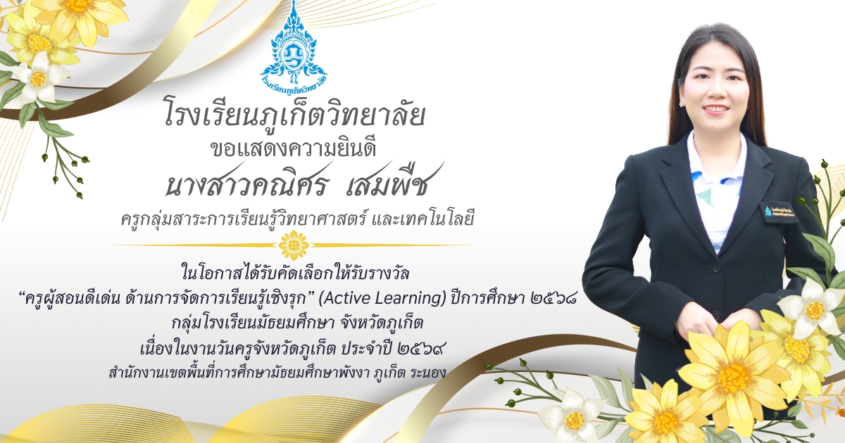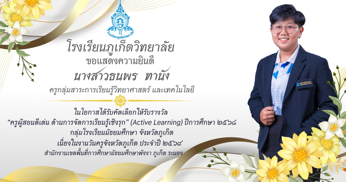 โรงเรียนภูเก็ตวิทยาลัย ยขอแสดงความยินดี ขอแสดงความยินดีกับ คณะครูและบุคลากรที่ได้รับการคัดเลือก เพื่อรับรางวัล “ครูผู้สอนดีเด่น ด้านการจัดการเรียนรู้เชิงรุก (Active Learning)” ประจำปี ๒๕๖๘ กลุ่มโรงเรียนมัธยมศึกษา จังหวัดภูเก็ต เนื่องในงานวันครูจังหวัดภูเก็ต ประจำปี ๒๕๖๙