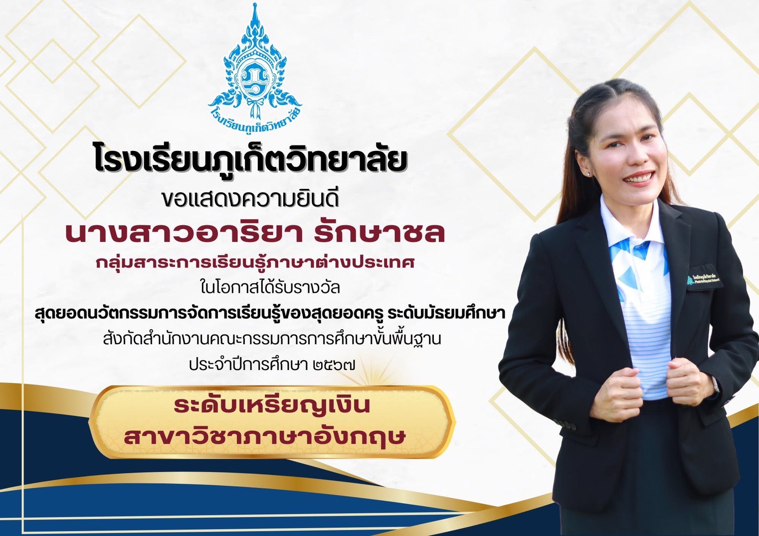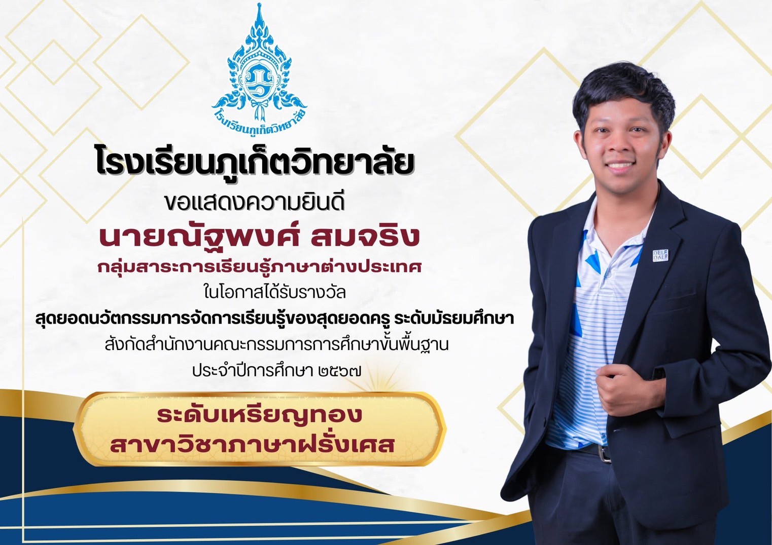 โรงเรียนภูเก็ตวิทยาลัย ขอแสดงความยินดี นายณัฐพงศ์ สมจริง คุณครูกลุ่มสาระการเรียนรู้ภาษาต่างประเทศ รับรางวัล สุดยอดนวัตกรรมการจัดการเรียนรู้ของสุดยอดครู ระดับมัธยมศึกษา “ระดับเหรียญทอง” สาขาวิชาภาษาฝรั่งเศส สังกัดสำนักงานคณะกรรมการการศึกษาขั้นพื้นฐาน ประจำปีการศึกษา 2567 นางสาวอาริยา รักษาชล คุณครูกลุ่มสาระการเรียนรู้ภาษาต่างประเทศ รับรางวัล สุดยอดนวัตกรรมการจัดการเรียนรู้ของสุดยอดครู ระดับมัธยมศึกษา “เหรียญเงิน” สาขาวิชาภาษาอังกฤษ สังกัดสำนักงานคณะกรรมการการศึกษาขั้นพื้นฐาน ประจำปีการศึกษา 2567