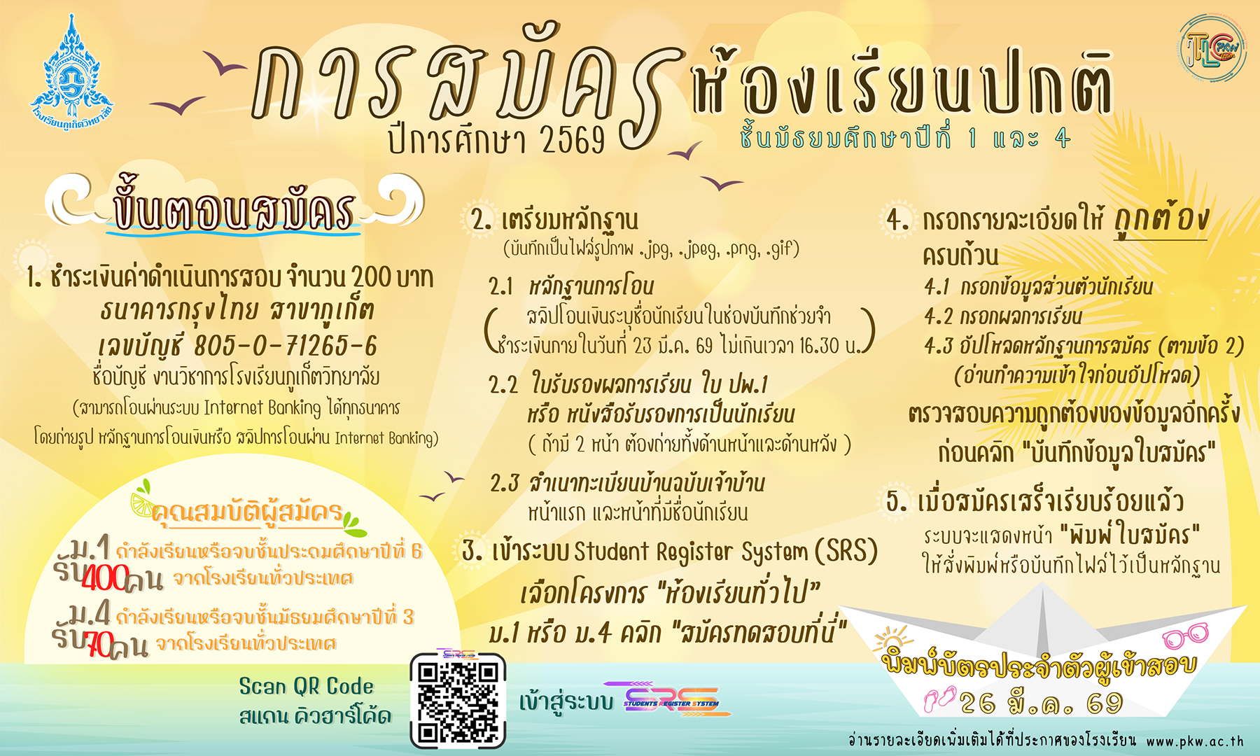 ขั้นตอนการสมัครและการตรวจสอบสถานะการสมัคร ห้องเรียนปกติ ชั้นมัธยมศึกษาปีที่ 1 และ 4 ปีการศึกษา 2569