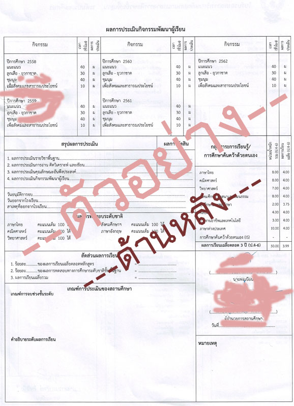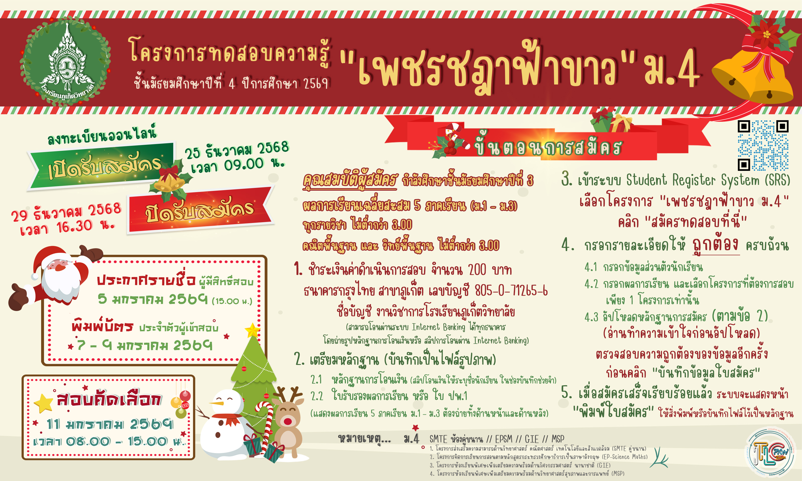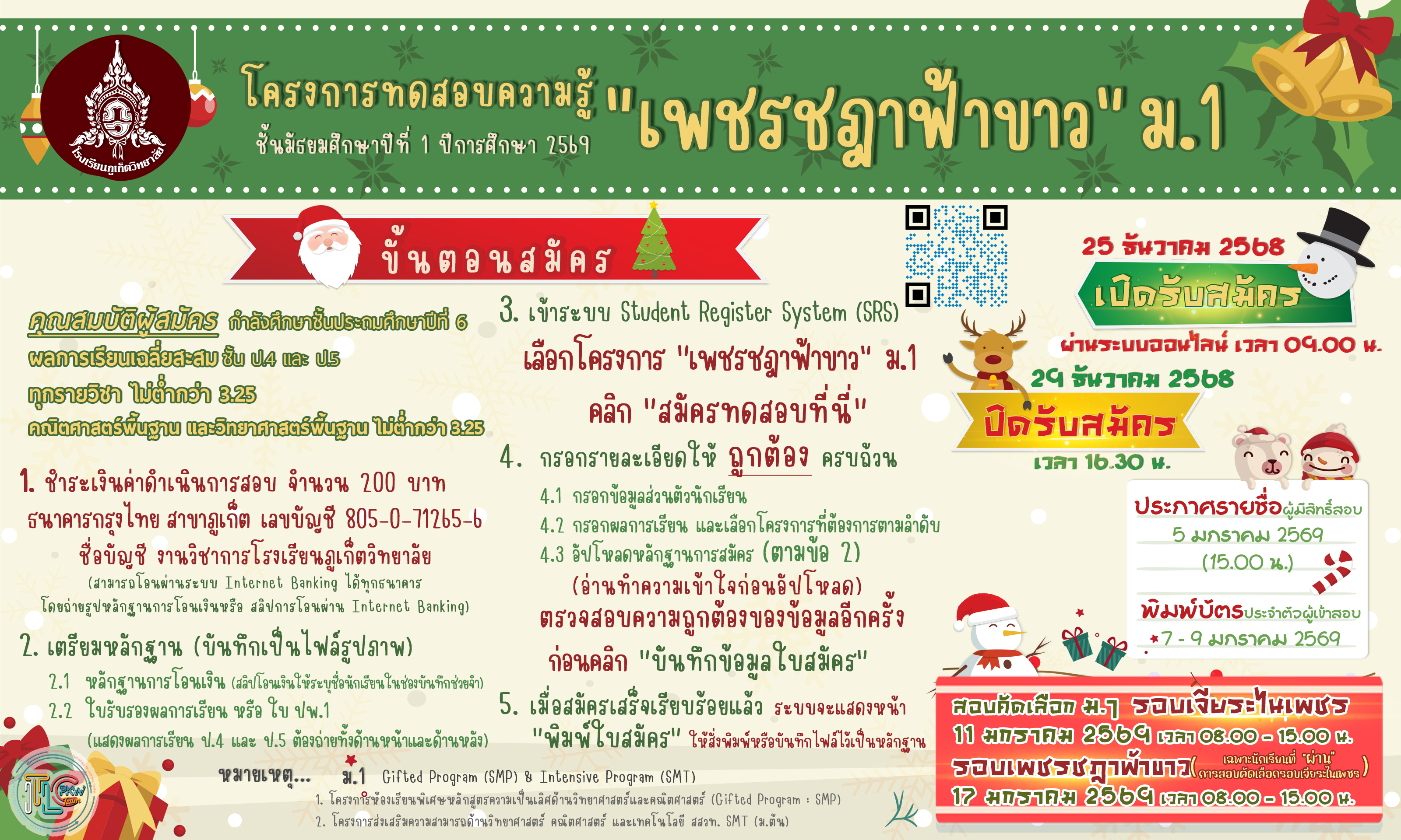 ขั้นตอนการสมัครโครงการทดสอบความรู้ "เพชรชฎาฟ้าขาว" ชั้นมัธยมศึกษาปีที่ 1 และ 4 ปีการศึกษา 2569 ตัวอย่างสลิปโอนเงิน ตัวอย่าง ปพ.1 ด้านหน้า ตัวอย่าง ปพ.1 ด้านหลัง