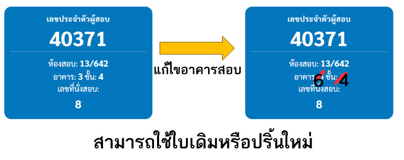 แก้ไขการพิมพ์บัตรประจำตัวผู้เข้าสอบ โครงการทดสอบความรู้ "เพชรชฎาฟ้าขาว" แก้ไขข้อมูลอาคารรสอบ บัตรประจำตัวผู้เข้าสอบชั้น ม.4 ถ้า Print แล้ว สามารถใช้ใบเดิมได้ หรือจะ Print ใบใหม่ก็ได้