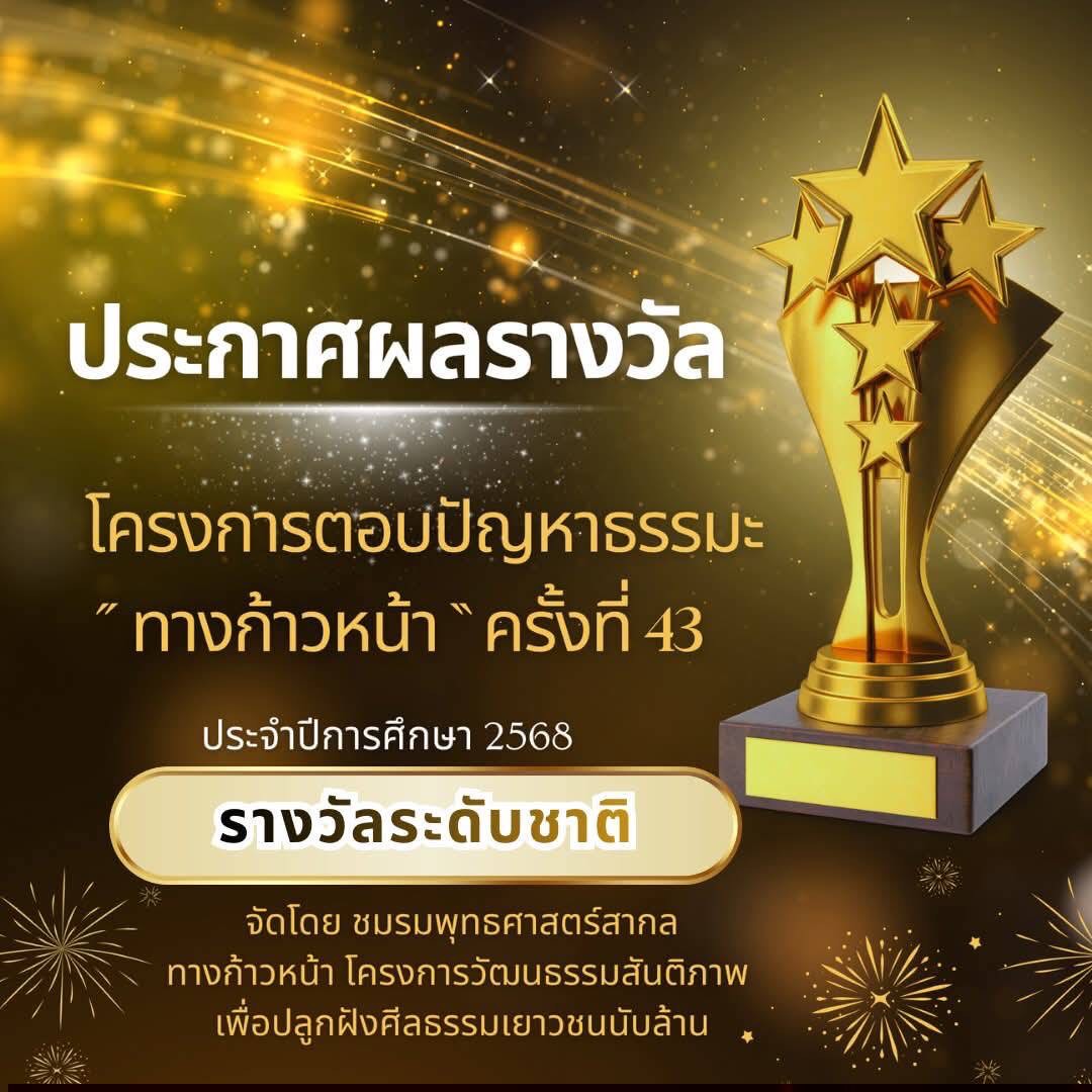 เรื่อง: รับรางวัล การแข่งขันโครงการ ตอบปัญหาธรรมะทางก้าวหน้า ครั้งที่ 43 ชิงโล่พระราชทาน รอบชิงชนะเลิศระดับชาติ