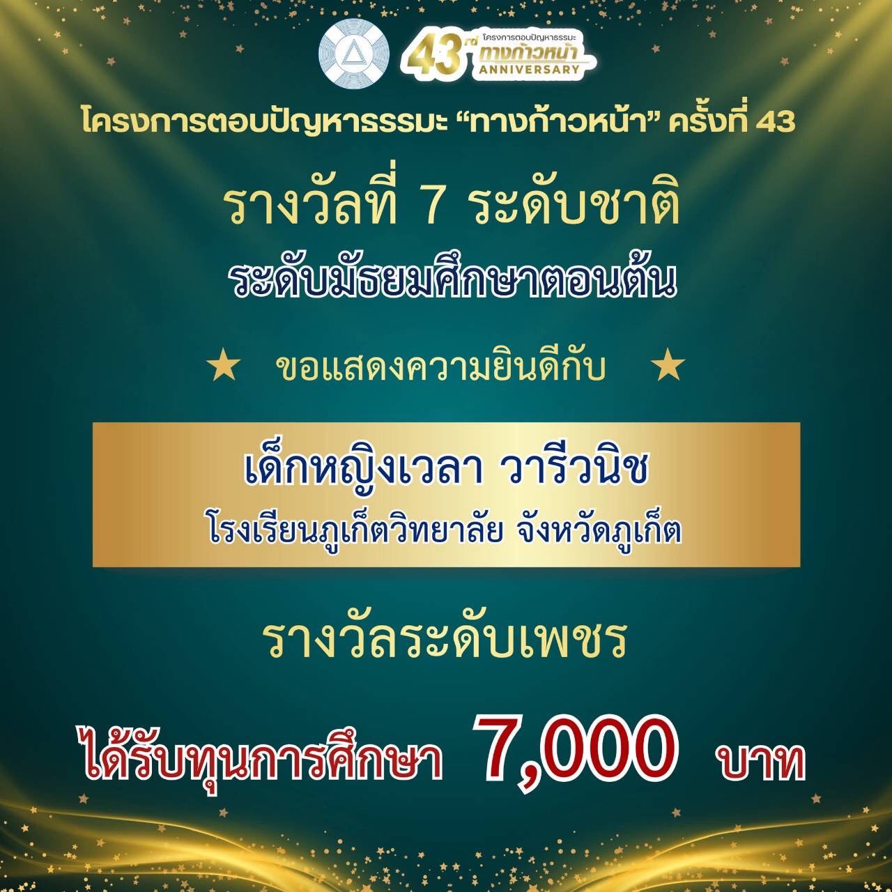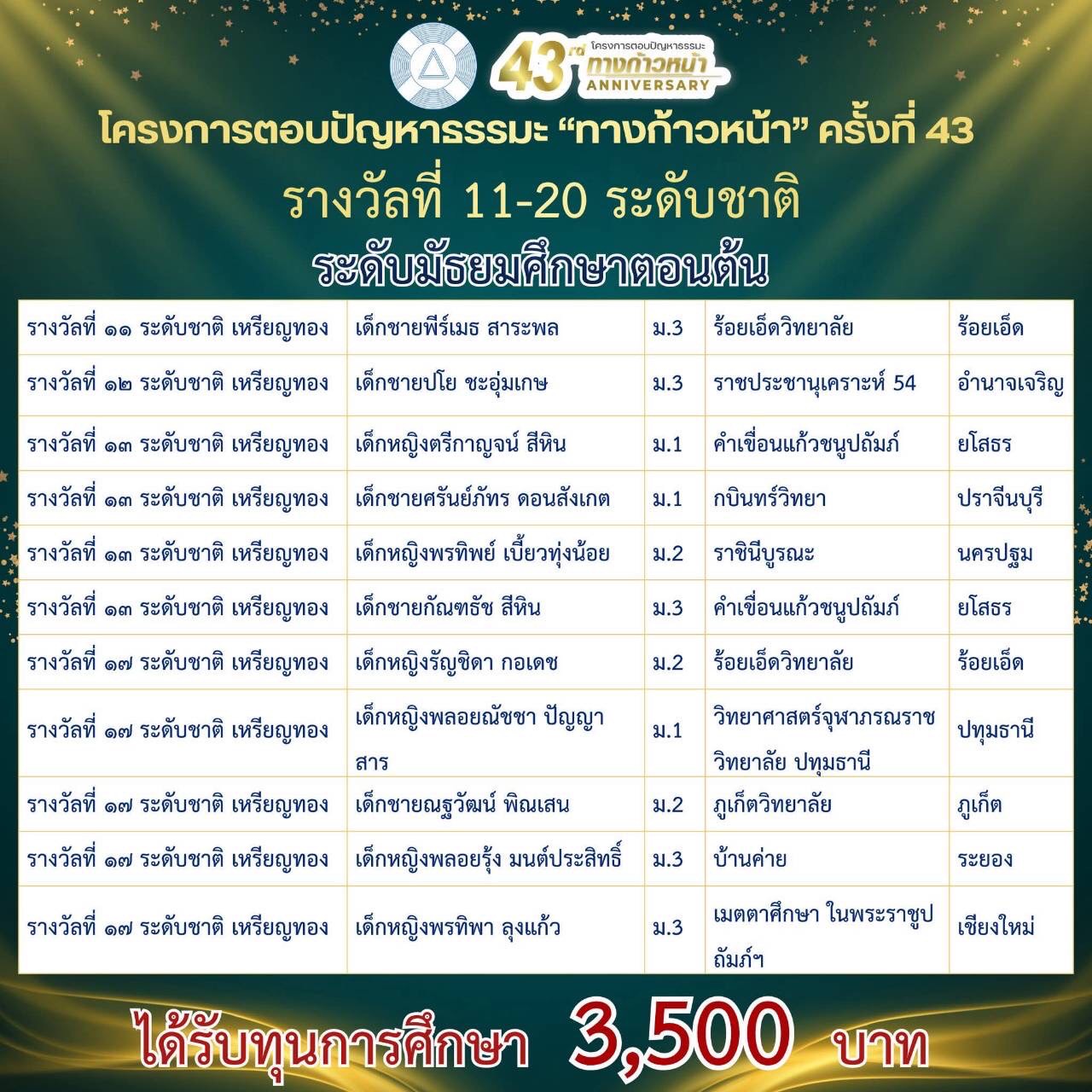 รางวัลอันดับ 17 ระดับชาติ เหรียญทอง รับเกียรติบัตร พร้อมเงินรางวัล 3,500 บาท