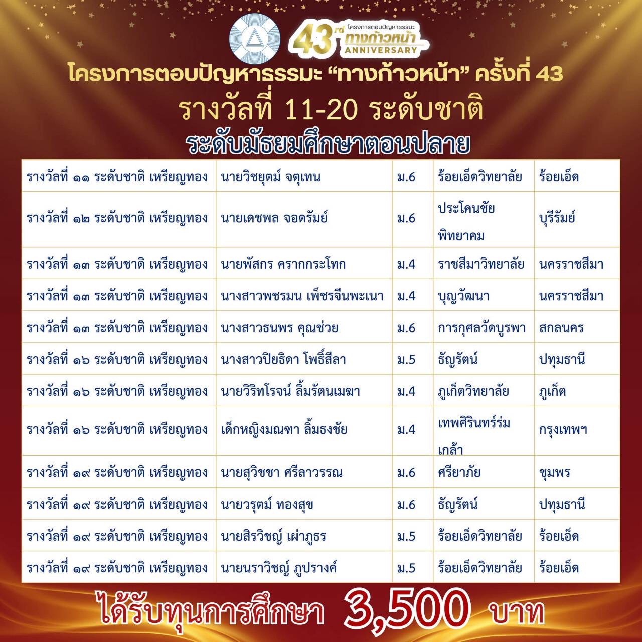 รางวัลอันดับ 16 ระดับชาติ เหรียญทอง รับเกียรติบัตร พร้อมเงินรางวัล 3,500 บาท