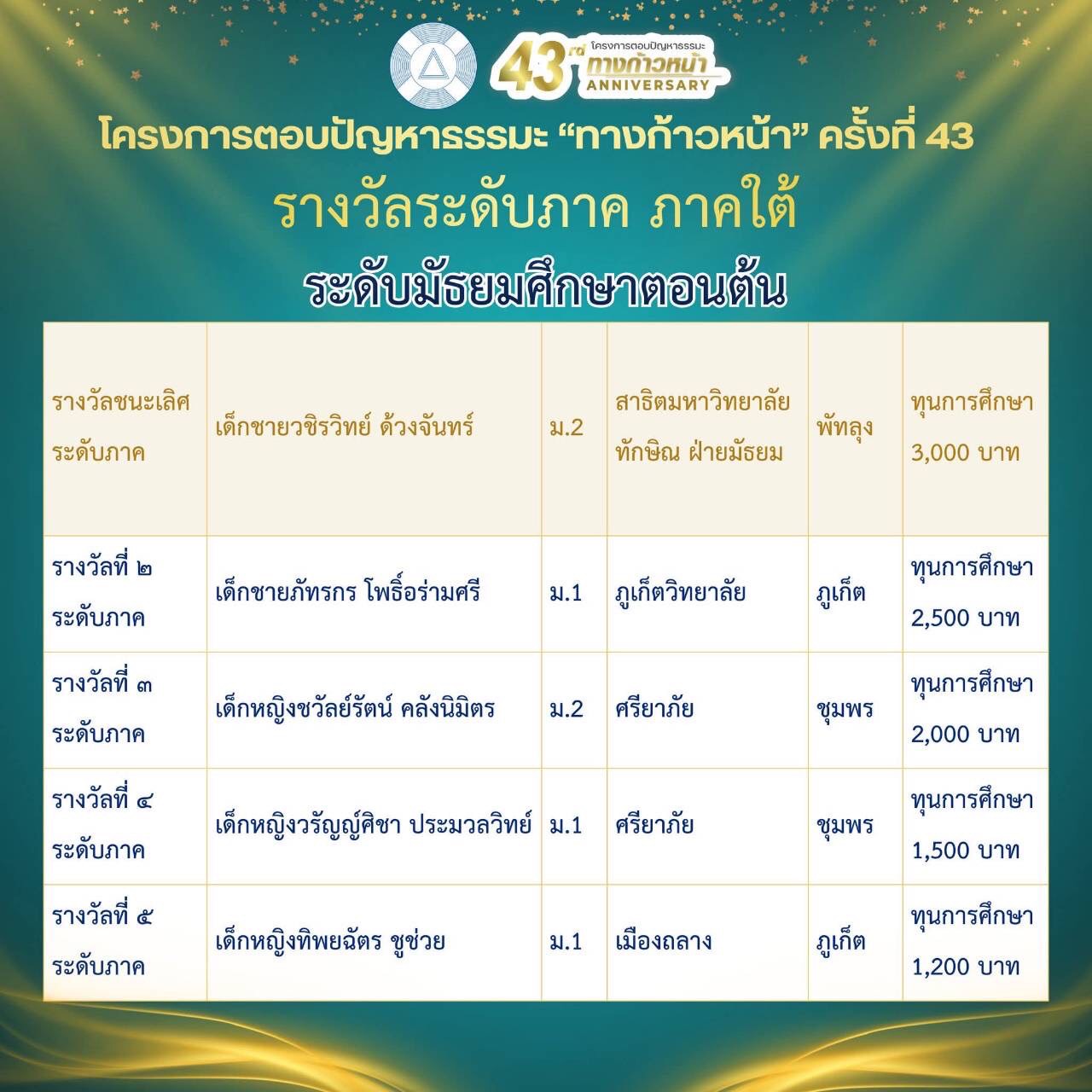 รางวัลชนะเลิศ ประเภทคะแนนรวมระดับภาค ระดับชั้นมัธยมศึกษาตอนต้น รับรางวัล 10,000 บาท