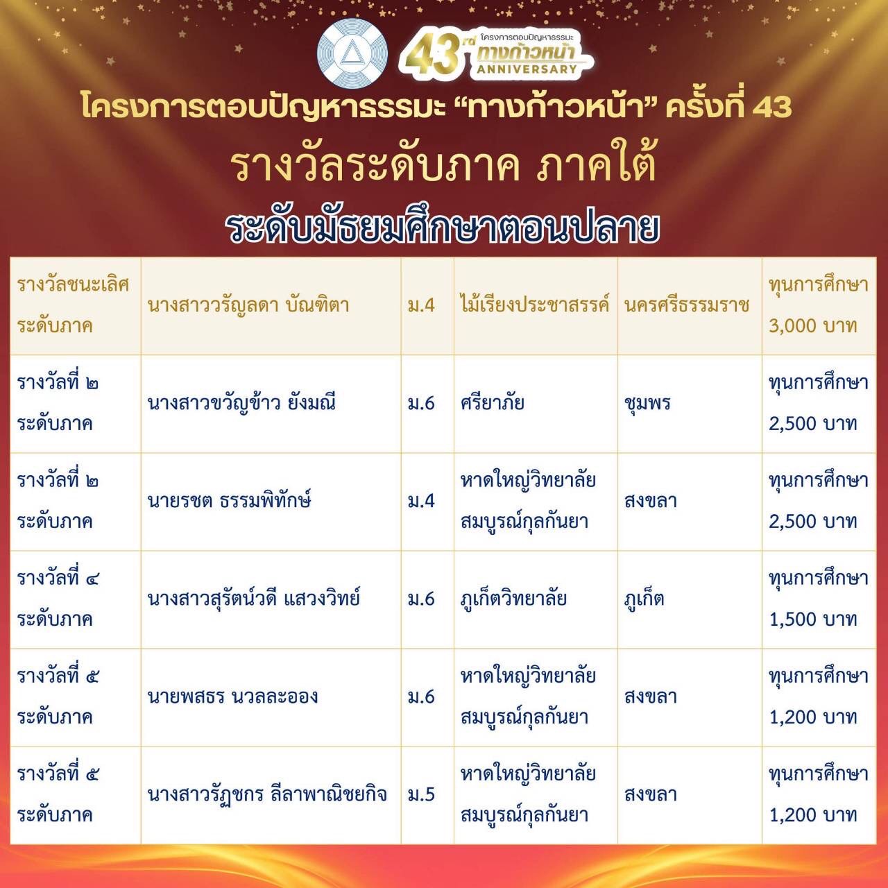 รางวัลอันดับ 4 ระดับภาค รับเกียรติบัตร พร้อมเงินรางวัล 1,500 บาท