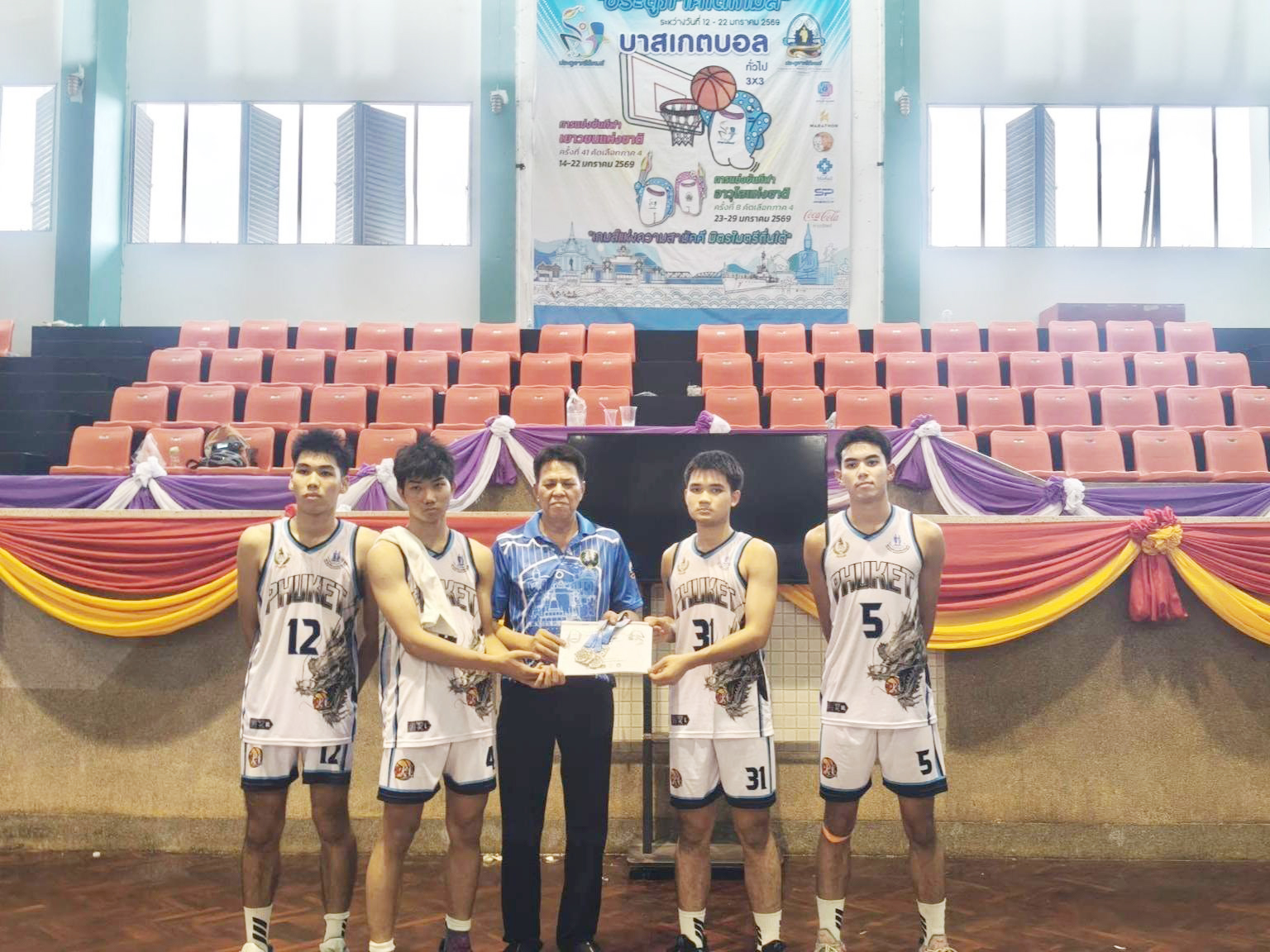 โรงเรียนภูเก็ตวิทยาลัยขอแสดงความชื่นชม ยินดี นักบาสเกตบอลชาย โรงเรียนภูเก็ตวิทยาลัย รางวัลรองชนะเลิศ อันดับ 1 ผ่านการคัดเลือกเป็นตัวแทนภาค 4 กีฬาเยาวชนแห่งชาติ ครั้งที่ 41 “สุราษฎร์ธานีเกมส์” ประเภทบาสเกตบอลชาย 3x3 การแข่งขันกีฬาเยาวชนแห่งชาติ ครั้งที่ 41 คัดเลือกภาค 4 “ประตูภาคใต้เกมส์” ระหว่างวันที่ 19 - 22 มกราคม 2569 ณ สนามกีฬากลางจังหวัดชุมพร
