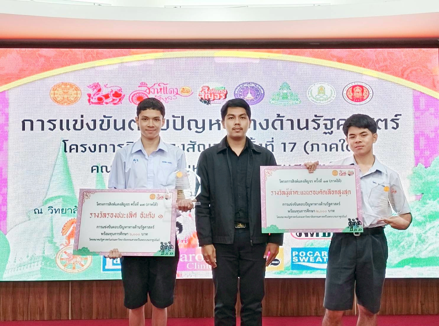 รางวัลผู้ทำคะแนนรอบคัดเลือกสูงสุดในการแข่งขันตอบปัญหาทางรัฐศาสตร์ รับโล่รางวัล เกียรติบัตร พร้อมเงินรางวัลจำนวน 2,000 บาท (ได้คะแนนเท่ากัน 2 คน) จาก รศ.ดร.ภูริ ฟูวงศ์เจริญ คณบดีคณะรัฐศาสตร์ มหาวิทยาลัยธรรมศาสตร์ การแข่งขัน “ตอบปัญหาทางด้านรัฐศาสตร์ " โครงการสิงห์แดงสัญจร ครั้งที่ 17 (ภาคใต้) ชิงถ้วยรางวัล นายอนุทิน ชาญวีรกูล นายกรัฐมนตรี จัดโดย สมาคมรัฐศาสตร์แห่งมหาวิทยาลัยธรรมศาสตร์ในพระบรมราชูปถัมภ์ ณ วิทยาลัยอาชีวศึกษานครศรีธรรมราช จังหวัดนครศรีธรรมราช ครูผู้ฝึกซ้อม นายเทิดธรรม ศรีสว่างนางสาวสุจินตนา ดีบุกสุขลาภ กลุ่มสาระการเรียนรู้สังคมศึกษา ศาสนาและวัฒนธรรม