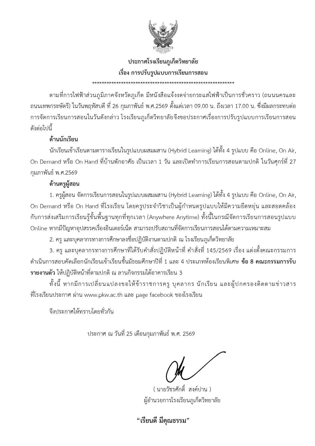 โรงเรียนภูเก็ตวิทยาลัย เรื่อง การปรับรูปแบบการเรียนการสอน เนื่องจากการไฟฟ้าส่วนภูมิภาคจังหวัดภูเก็ต แจ้งงดจ่ายไฟฟ้าเป็นการชั่วคราว (ถนนนครและถนนเทพกระษัตรี) ในวันพฤหัสบดีที่ 26 กุมภาพันธ์ พ.ศ. 2569 ตั้งแต่เวลา 09.00 น. ถึงเวลา 17.00 น.