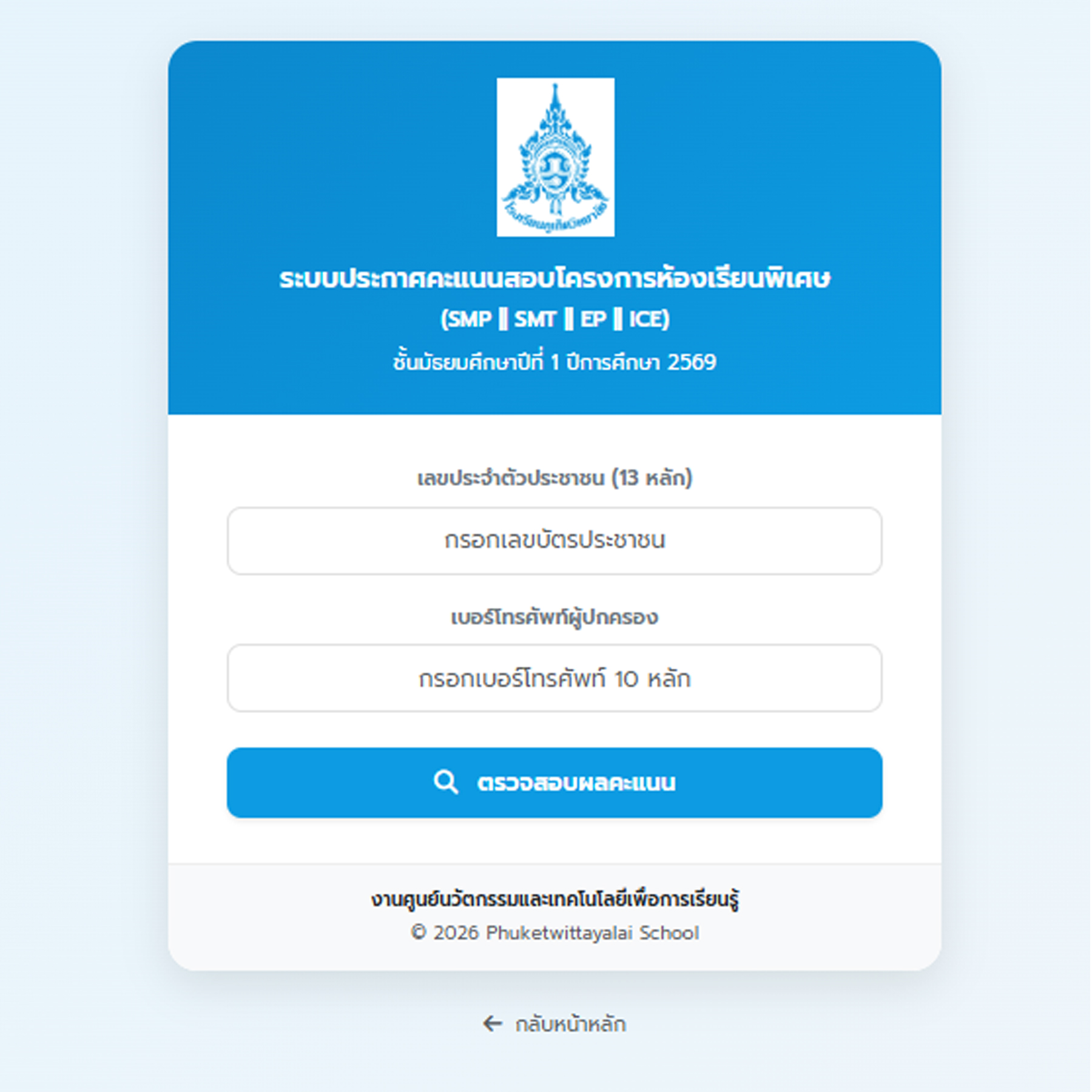 ประกาศคะแนนสอบห้องโครงการพิเศษ ชั้นมัธยมศึกษาปีที่ 1 ปีการศึกษา 2569 ขั้นตอนการดูคะแนนรายบุคคล เข้าระบบ SRS เลือก ห้องเรียนพิเศษ ม.1 (SMP, SMT, EP, ICE) กรอก 1. เลขบัตรประชาชนผู้สมัคร 2. เบอร์โทรศัพท์ผู้ปกครอง หมายเหตุ: เป็นคะแนนที่ยังไม่ผ่านการประเมินตามโครงการต่าง ๆ ที่นักเรียนเลือกไว้