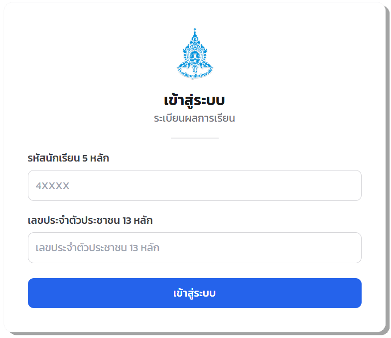 เปิดระบบวันที่ 14 มีนาคม 2569 เวลา 09.00 น. โดยให้นักเรียนใช้ user และ password ตามตัวอย่าง user : เลขประจำตัวนักเรียน password : เลขบัตรประชาชน ดูผลการเรียน เว็บหลัก || เว็บสำรอง